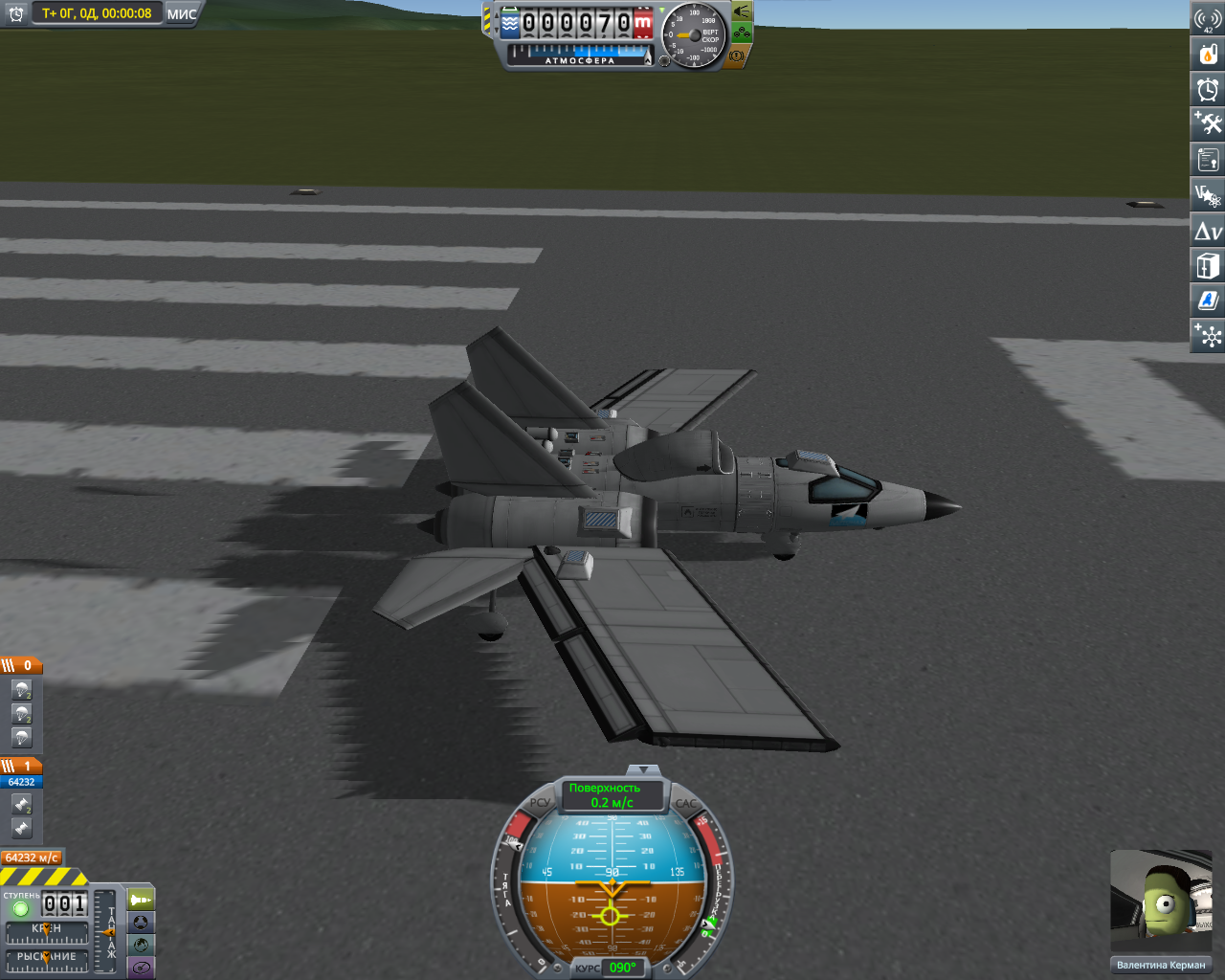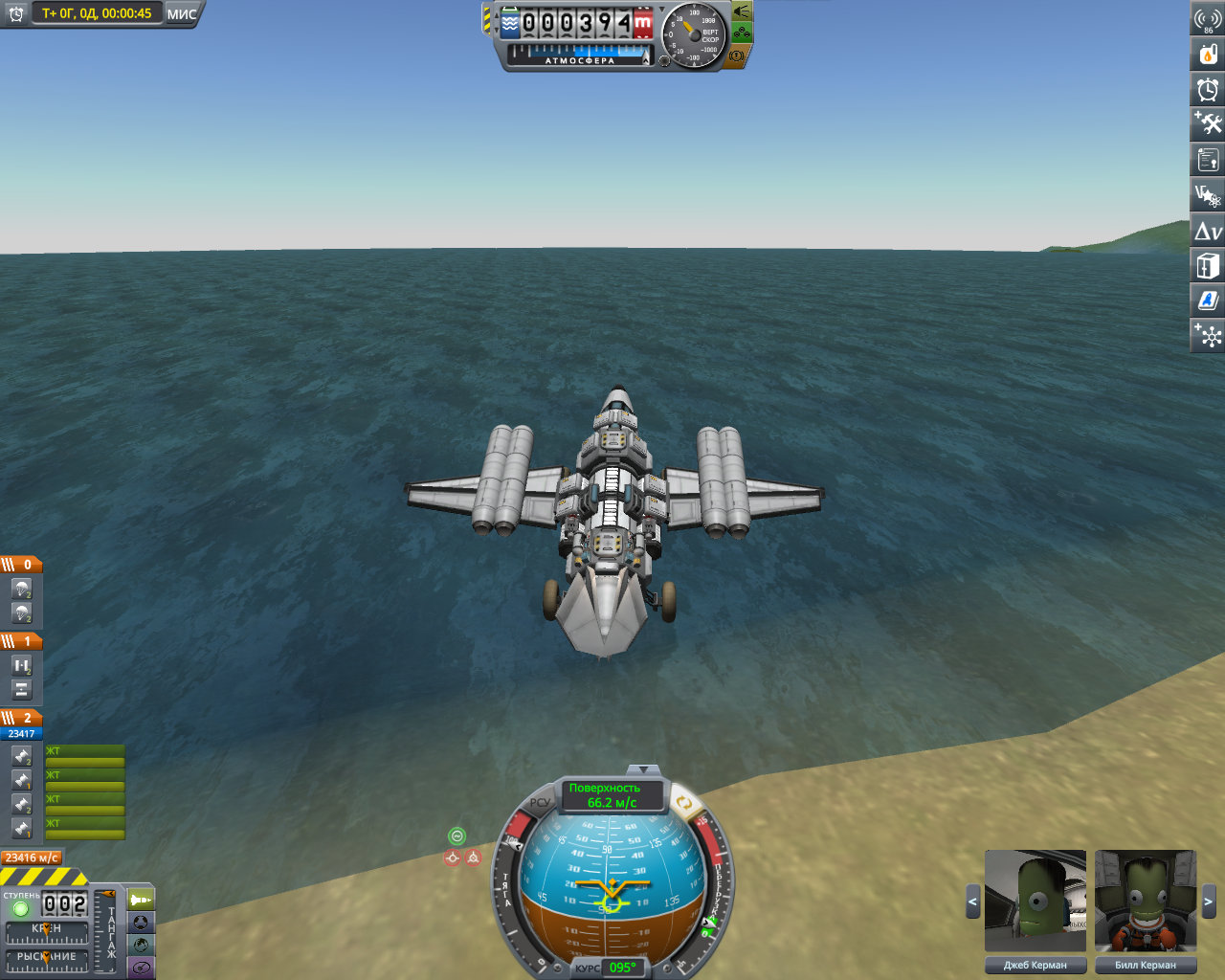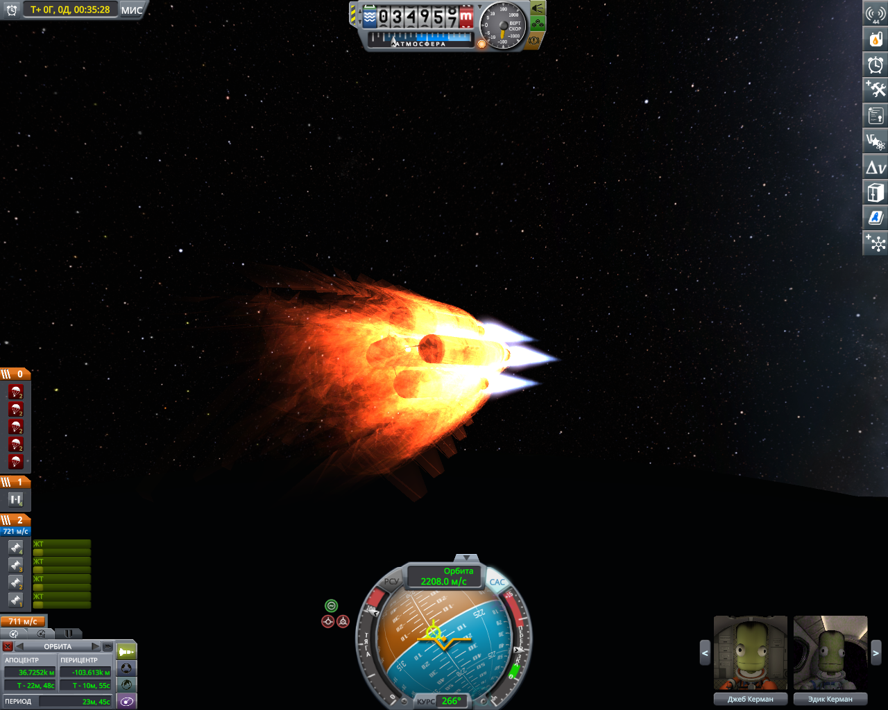 >>816804 Накидал по памяти двухступенчатый крафт. Ебаться пришлось не с дельтой и не с разделением-переключением, а с тем, что евовская гравитация ломает шасси, верхние слои атмосферы больно жгут при входе, а в нижних самолет бесоебит. Вторую ступень лучше заправлять на орбите, гасить 3 км/с об атмосферу мне не понравилось. За ССТО и пропеллерами на ютуб, задроты давно это осилили.