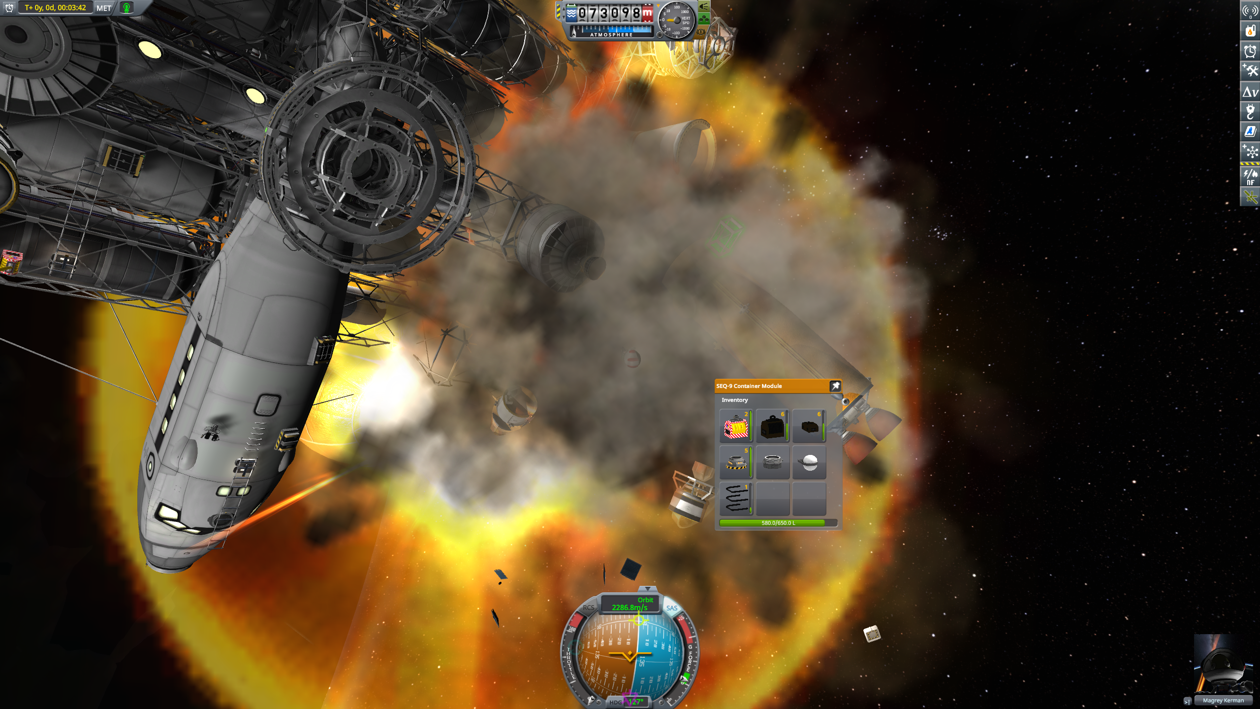 Разогнались, раскочегарили научное оборудование, запустили лабораторию, ждём первого коррекционного маневра. Замечаем, что у нас на максимальном таймворпе утекает водород, хотя энергии для холодильников должно хватать. Оказывается ёмкости батарей не хватает на длительность тика на максимальном ворпе. Окей, в следующий раз надо ставить больше батарей, а пока медленно и уныло плетёмся на предпоследней скорости.