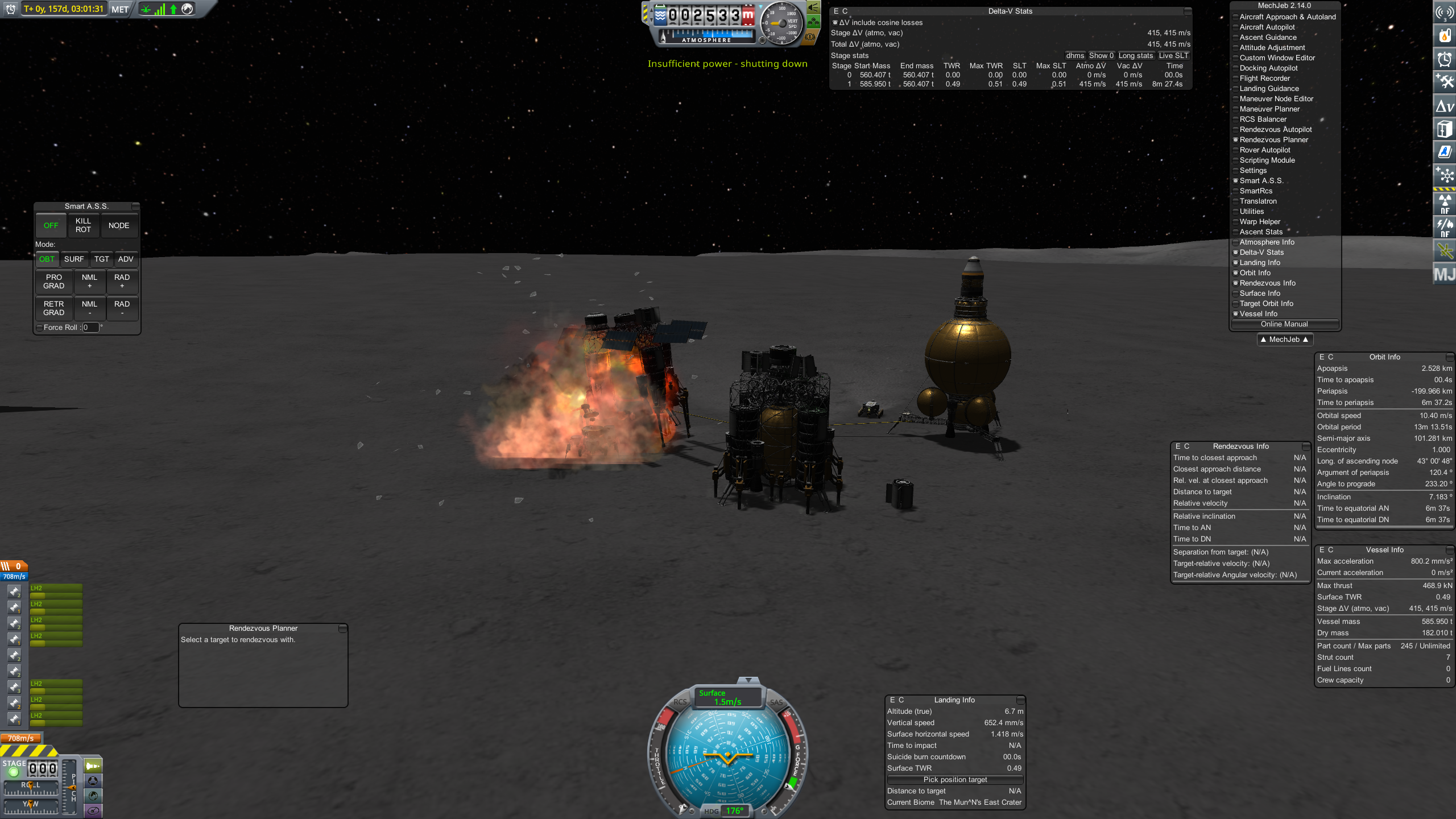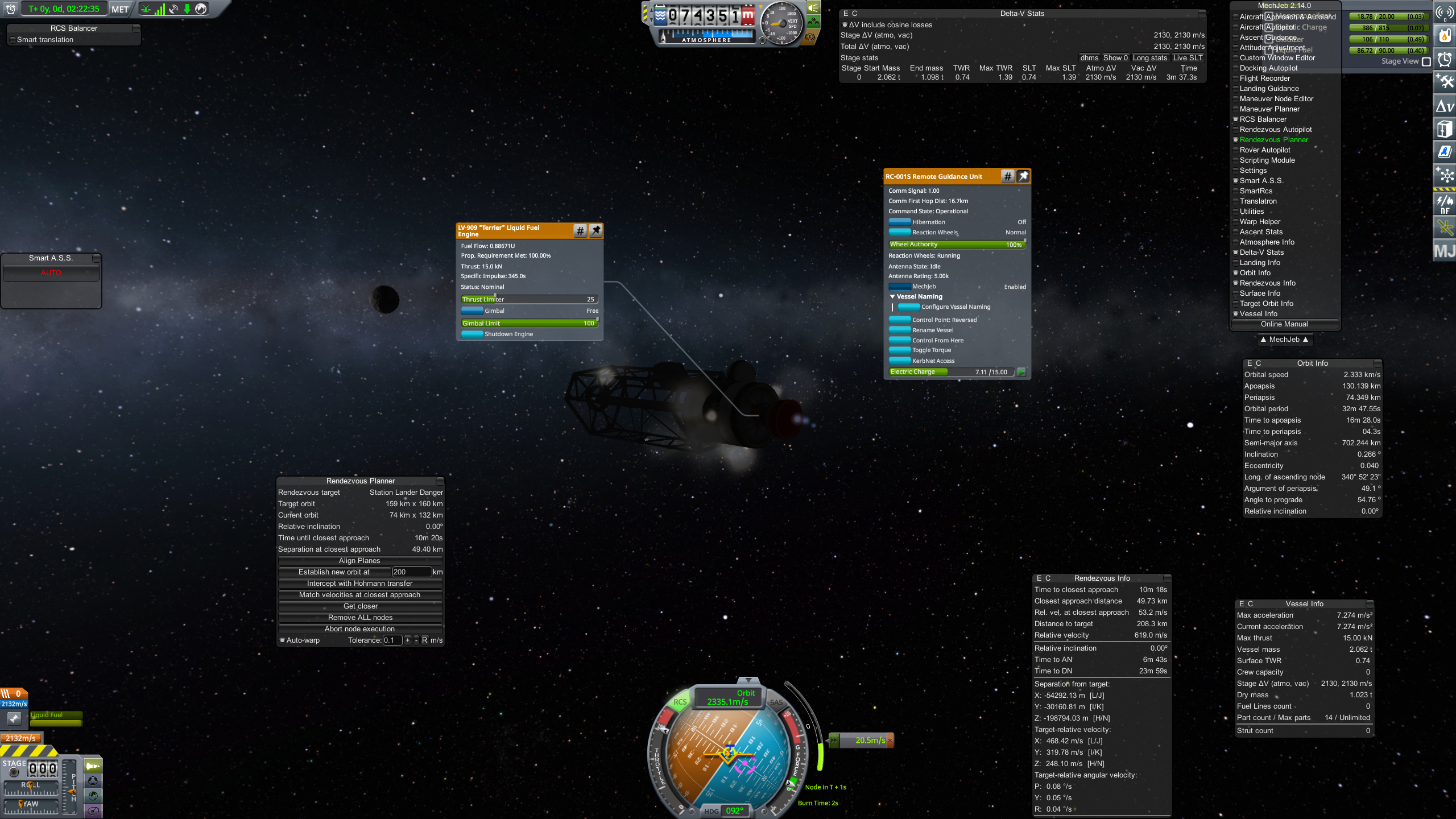 >>801375 Для полета на местную луну в стоке(без рескейлов системы) с головой хватает стоковой ракеты Kerbal X. Топлива там мягко говоря с запасом. И да, для обратной дороги тоже. Если тебе сложно скачай Mechjeb. Не обязательно использовать его функции автопилота. Так буквально есть планировщик манёвров. Выбираешь целью луну, будучи на орбите Кербина, открываешь его меню - Maneuver planner - трансфер на луну - он сам строит достаточно экономный манёвр для полета, дальше или выполняешь его руками или жмешь кнопку "сделать заебись" и он сам всё прокрутит и даст ускорение.