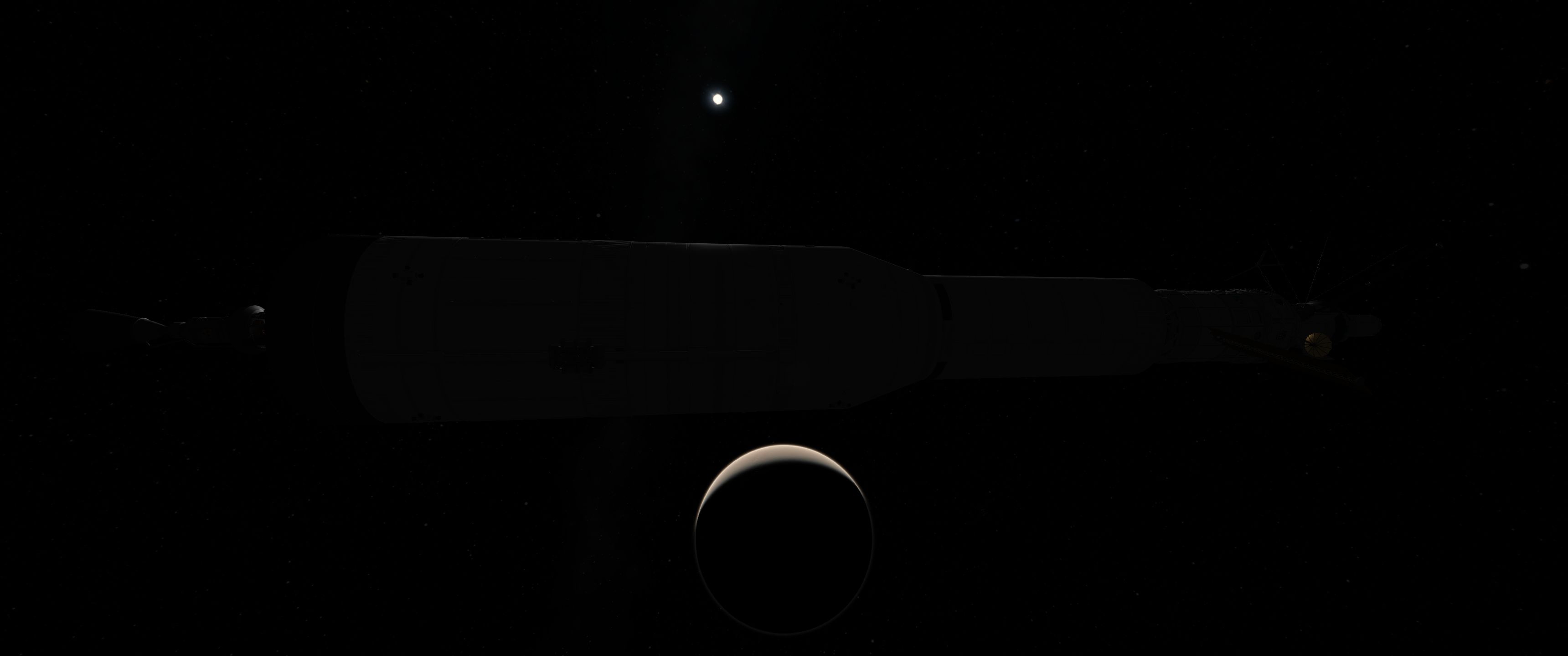 Прикинул тяжёлую ебалайку на ядерных клиновоздушных движках, который Сцилла из KerbalAtomics — получается 100-метровое 1000-тонное чудовище, которое непонятно, из каких деталей делать, OPT слишком маленькие. Не уверен, что буду.