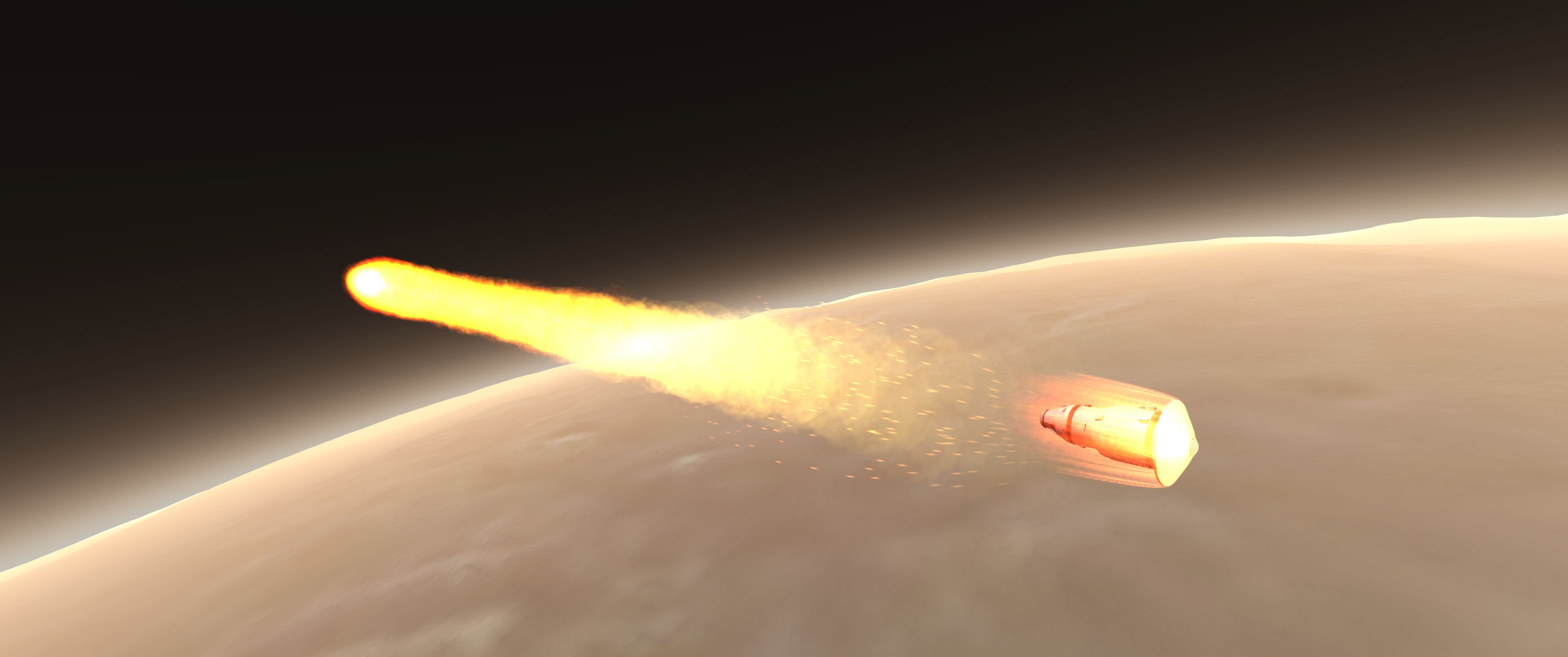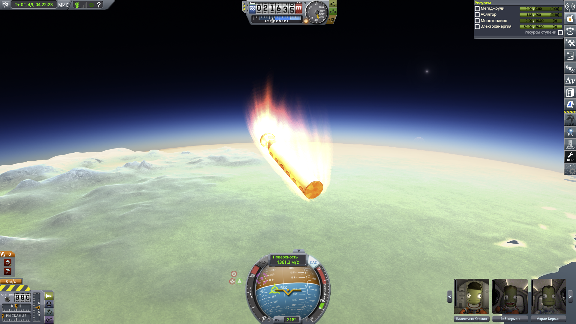 Уныло летим почти год домой. По прилёту домой отделяем возвращаемую капсулу и входим в атмосферу. Изначально я думал, что сам межпланетный корабль смогу перевести на орбиту вне атмосферы и пусть он летит дальше куда хочет, но из-за проёбов по топливу переводить его нечем. Он вслед за капсулой входит в атмосферу, разрушается и засирает изотопами полконтинента. Извините, в следующий раз буду аккуратнее. Ядерные технологии - вещь опасная.