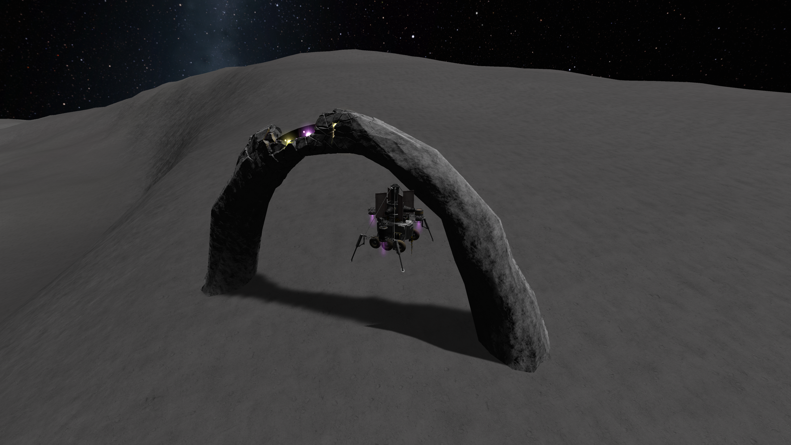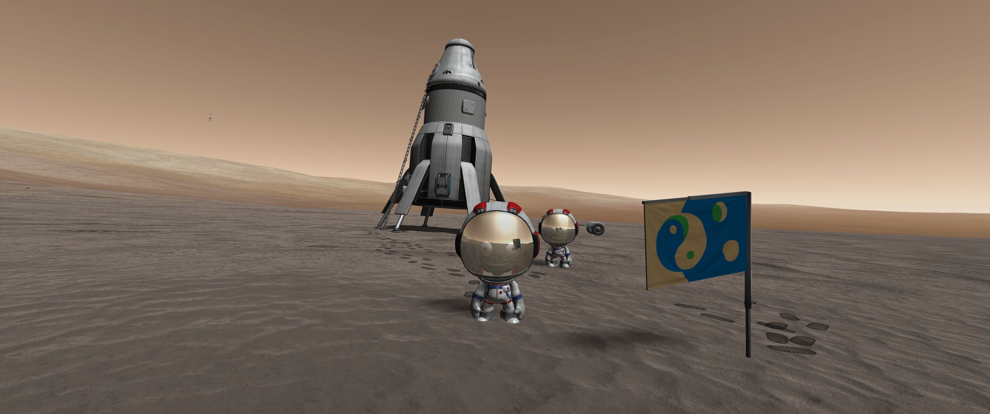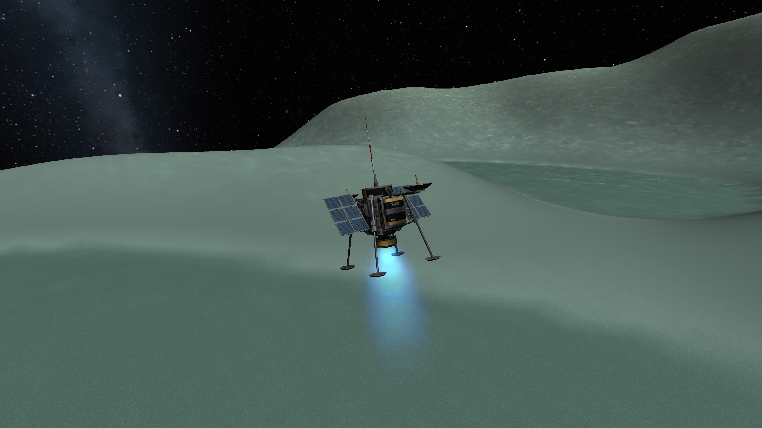 Выводим наш корабль на низкую орбиту. Боковые бустеры отрабатывают разгон к Йоте и отцепляются. Лететь примерно 12 "дней" я буду всё считать в стоковых 6-часовых, чтобы не путаться в зоопарке хронологий разных модов. Тормозим мощным двигателем, перед самой посадкой отстёгиваем ступень его и мягко садимся на маахоньких посадочных движках. Втыкаем флаг, фоткаемся, собираем образцы. Сели мы в каньоне. Хотелось бы подняться из каньона и собрать образцы грунта с йотовских нагорий, но пешком лениво.