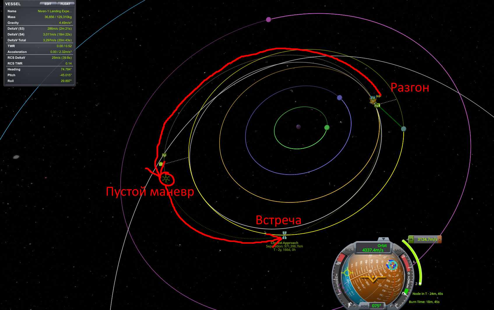 >>789040 Хозяйке на заметку: огуречный движок показывает ближайшую по расстоянию встречу с целью, даже если она будет через ёбаные 70 лет. Чтобы показать встречу, которая нужна лично вам в нужное время, киньте на траекторию перед ней пустую маневровую ноду.