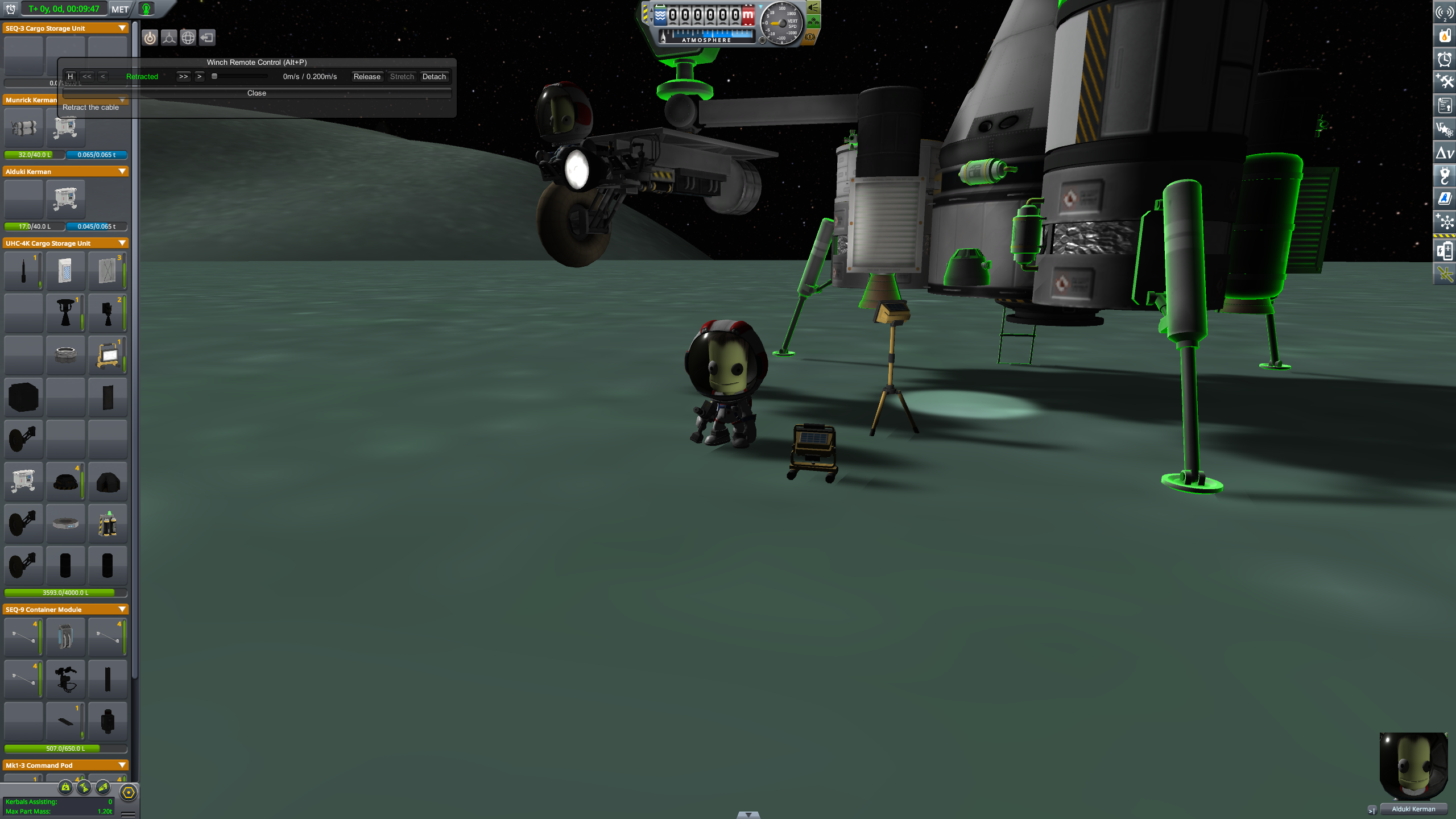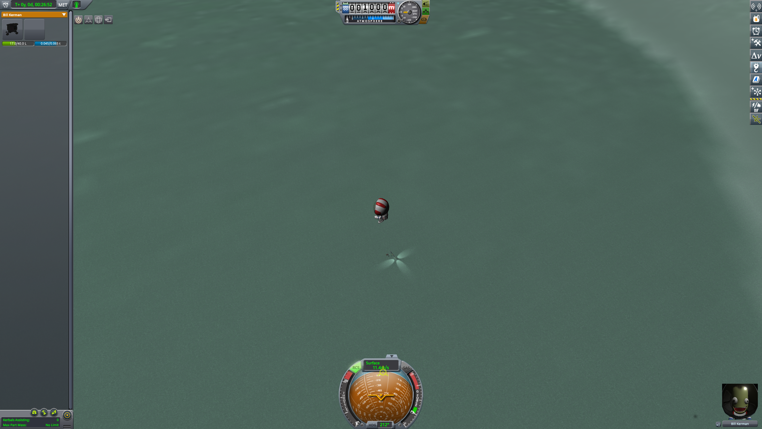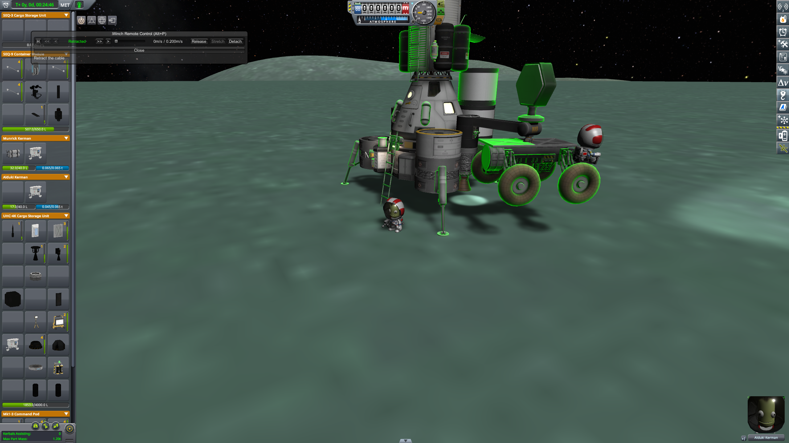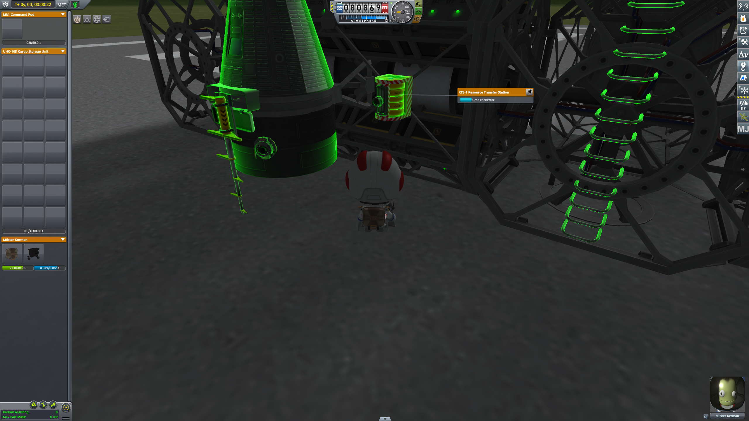 >Ну и до сих пор не разобрался как еду выращивать, или как это происходит. Цикл - 200 дней. Нужна теплица, электричество, углекислый газ и аммиак. Одна теплица даст еды примерно на 1го кербала. Без любого ресурса (кислород, Вода, еда) кербал живёт ещё неделю. Правда в обморок падает.