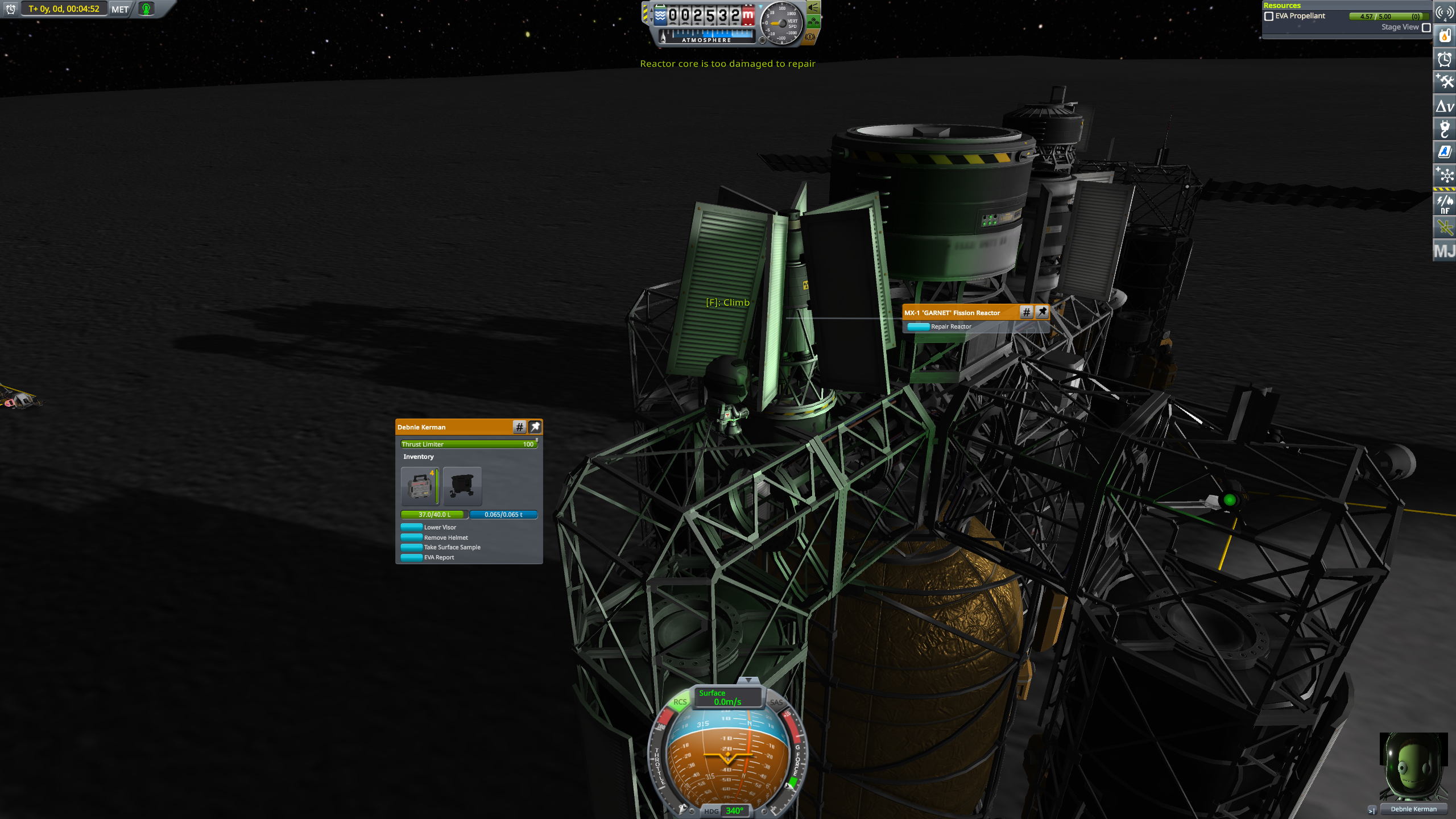 Впилил в двигатель реактор (как сделать нормальные потери тепла по экспоненте - Х.З.) Сделал замену топлива как в реакторе из NearFutureElectrical (пока не остынет - ничего не слелаешь, а остывает этот двигун долго... Хочу запилить для управления ЯРД необходимость экипажа из пилота и инженера - сделать это возможно, но как именно- доков по всяким параметрам у меня нет.