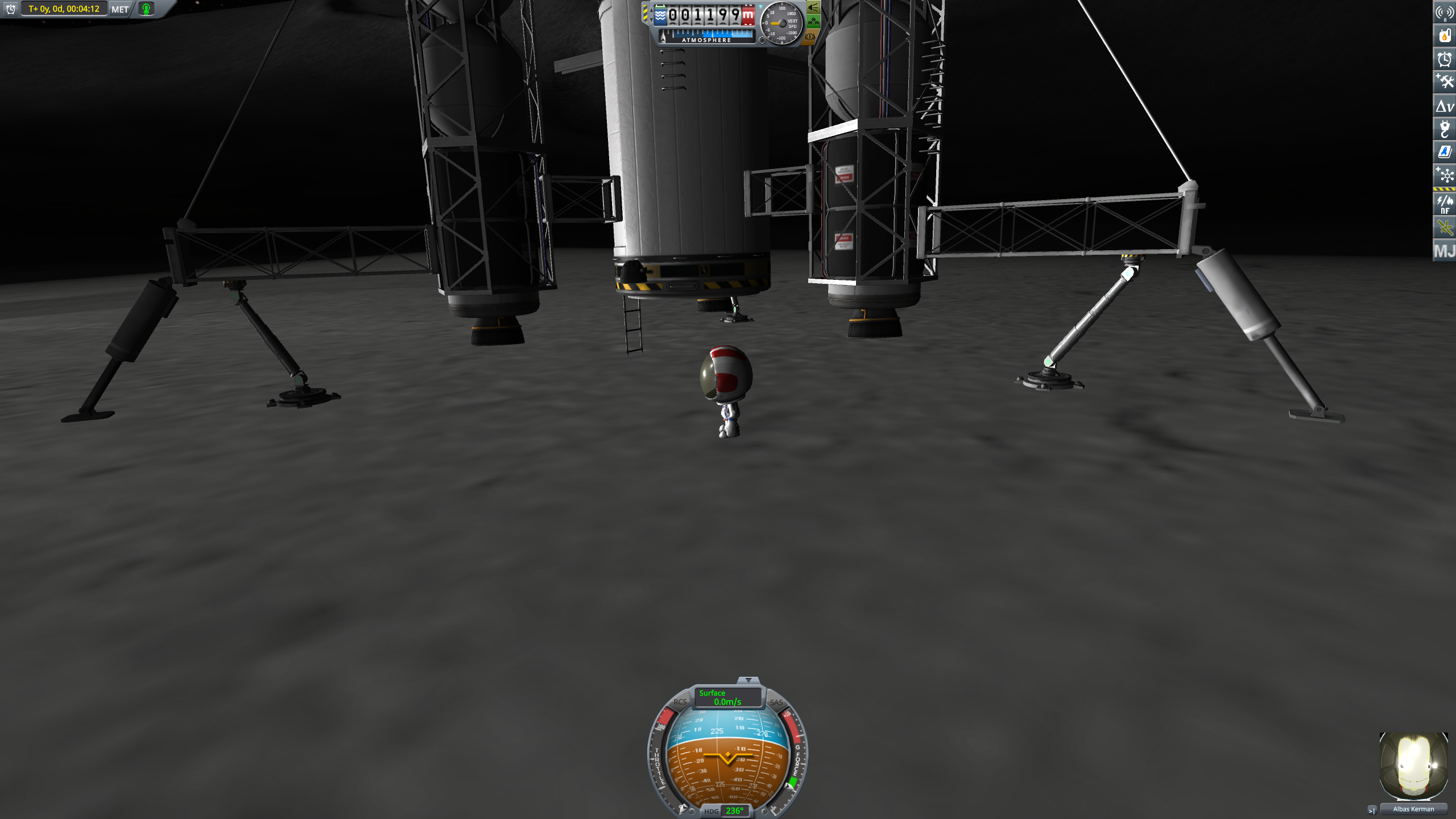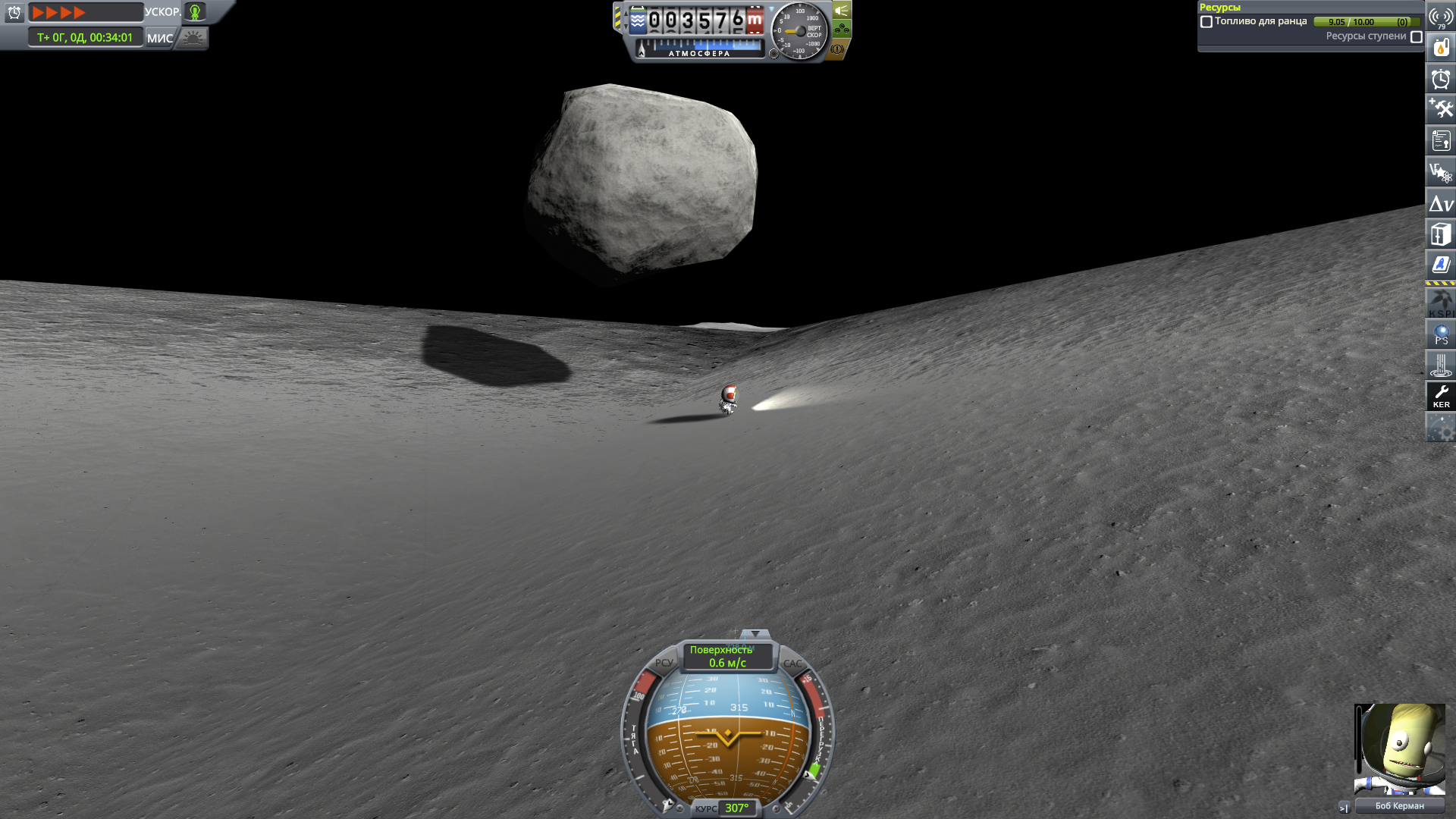 Не хватило топлива на посадку. Если предпоследнюю ступень сбросить — корабль бы упал на бок, а в последней не хватает тяги всё это посадить. Флаг оставить хочется... Решение было принято радикальное: выкинуть огурца в космос на скорости 200м/с и высоте 10км. и вернуть корабль на орбиту. На посадку ушло всего 20% топлива в ранце и психическое состояние учёного, которому пришлось обнять еблом грунт чтобы погасить избыточную скорость. Скатился в кратер, забрался на край кратера пешком, походил под камнем, выкопал другой камень, посидел минуту на вершине 3.5км горки ожидая маршрутку. Хозяйке на заметку: для выхода на орбиту Муны с лихвой хватит 160% топлива в ранце. Так что с одним ранцем прыгать бесполезно, а вот с двумя может и получиться. В общем-то, маршрутка подобрала помятого учёного, выполнила ещё один квест на спасение, покинула орбиту и успешно нырнула в море через три входа в атмосферу. Чувствую себя покорителем.