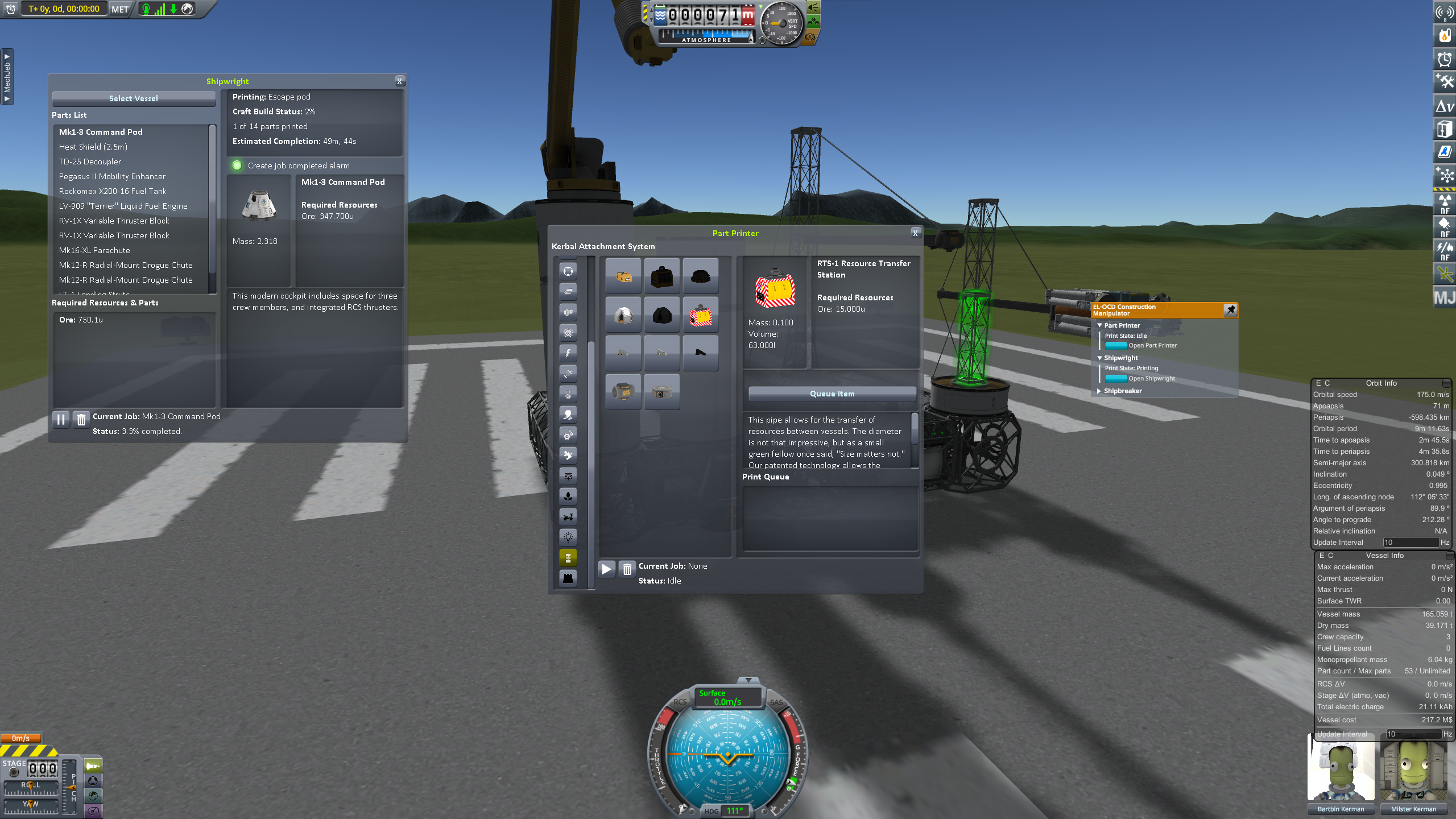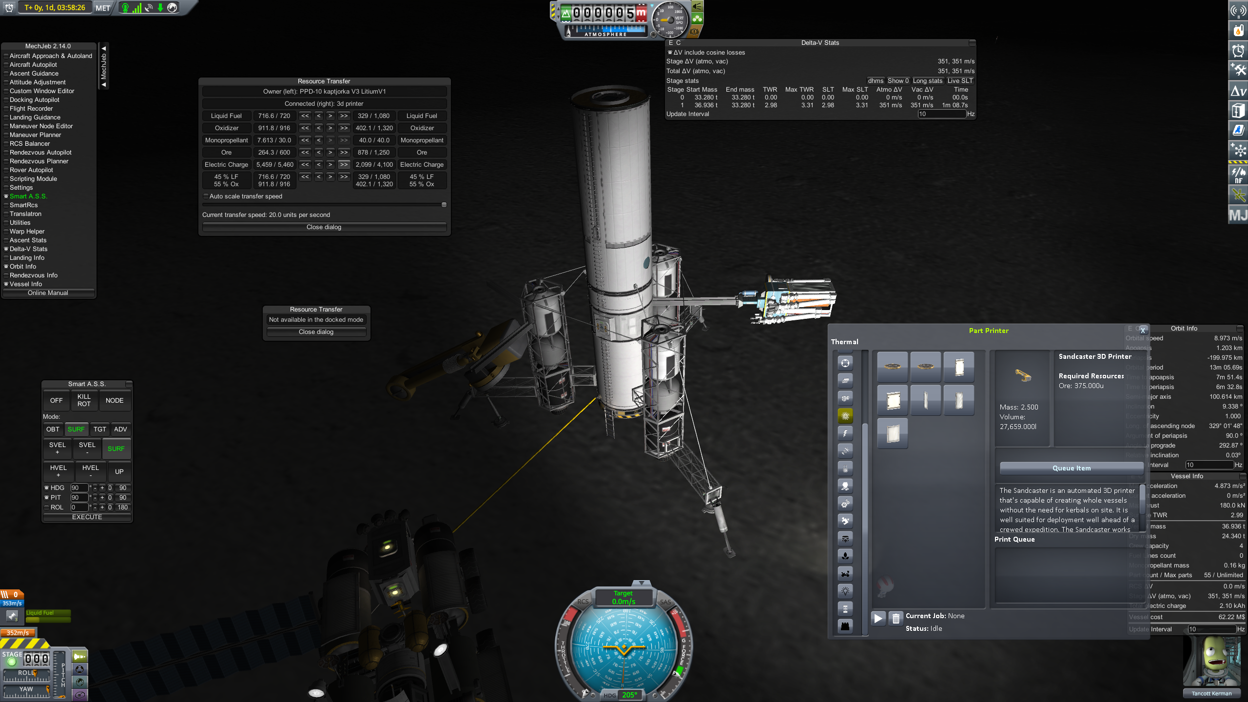 Очень интересный мод. Можно "напечатать" базу целиком. Можно печатать корабли (кроме бустеров - мод печатает без топлива) Вместо отправки ебейших размеров экспедиции, берёшь и отправляешь небольшой корабль с бурами и "3D принтером". И на месторождении можешь печатать из руды что угодно. Есть ещё корабельный блок для печати мелких деталей. Кербонавтов он тоже не печатает.