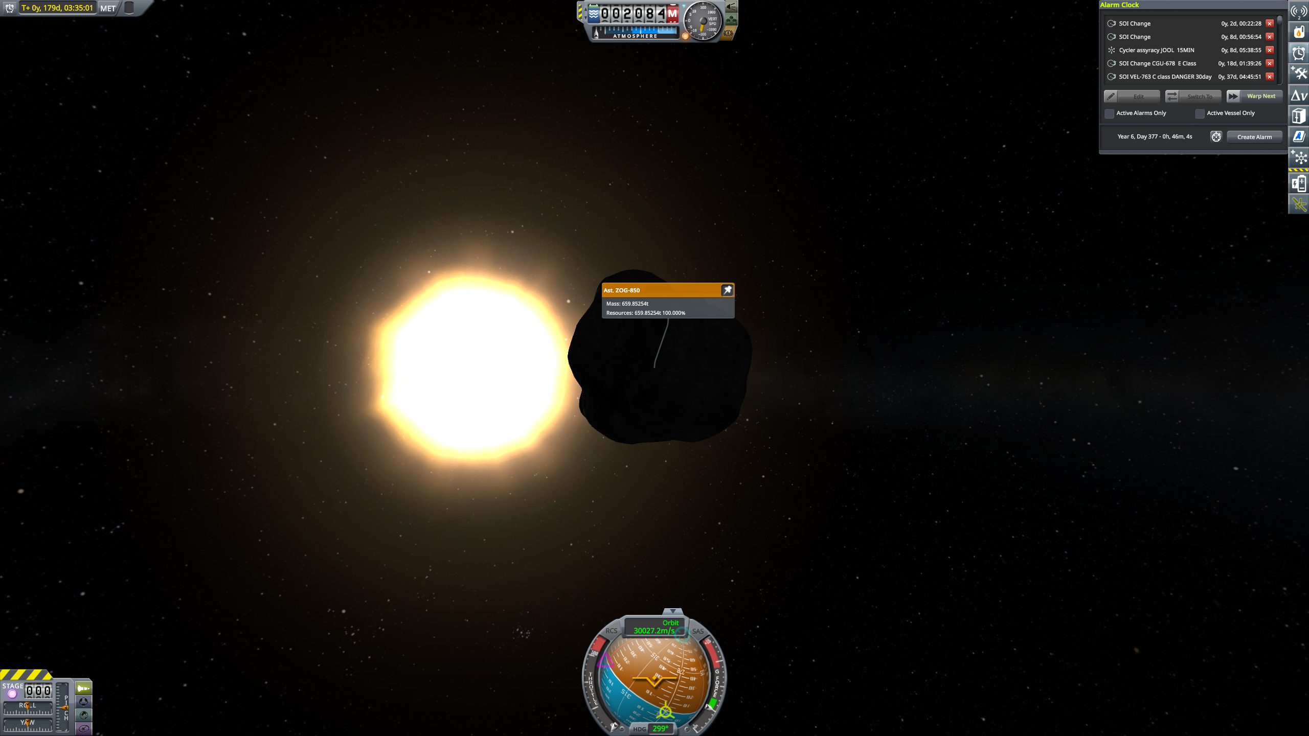 Тут оказывается, что я немного проебался с бюджетом (то ли проебал всё же испарение на таймворпе, то ли много потерял на наклонениях, то ли проебался в редакторе, инженер не всегда верно пишет, если у тебя куча двигателей на разных топливах и хитрый порядок включения) и водород для ЯРД закончился. Окей, последние капли разгона добиваем коррекционными движками.