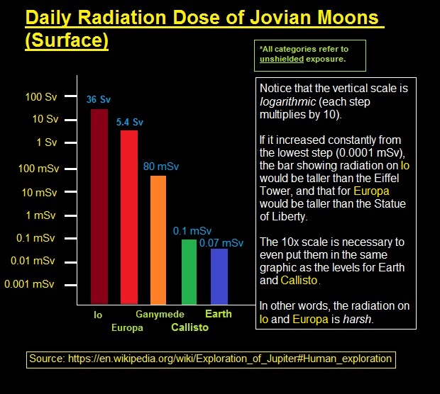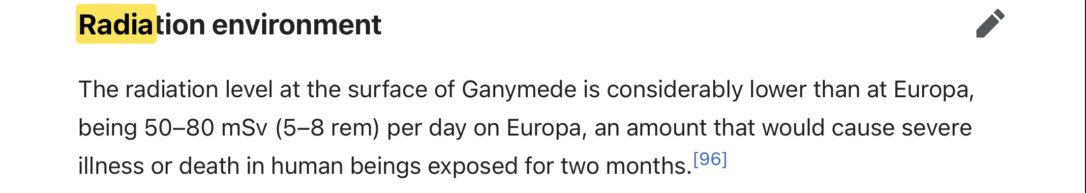 >>537352 Пиздец там с радиацией, ИО прямо в радиационном поясе болтается. Человек на поверхности получал бы около 36 Гр в день. при дозе поглощенного облучения 10 Гр — проявляется через 3 дня после полученной дозы, смерть наступает в течение 2 недель. Наблюдается тотальная гибель эпителия желудочно-кишечного тракта. при дозе поглощенного облучения 20 Гр и выше — проявляется с момента облучения и до нескольких часов после, смерть наступает в течение нескольких часов. Наблюдаются повреждения ЦНС, возникает отёк головного мозга, повреждение гематоэнцефалического барьера, при больших дозах — непосредственно гибель нейронов.