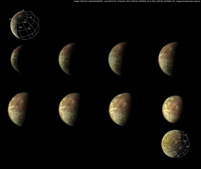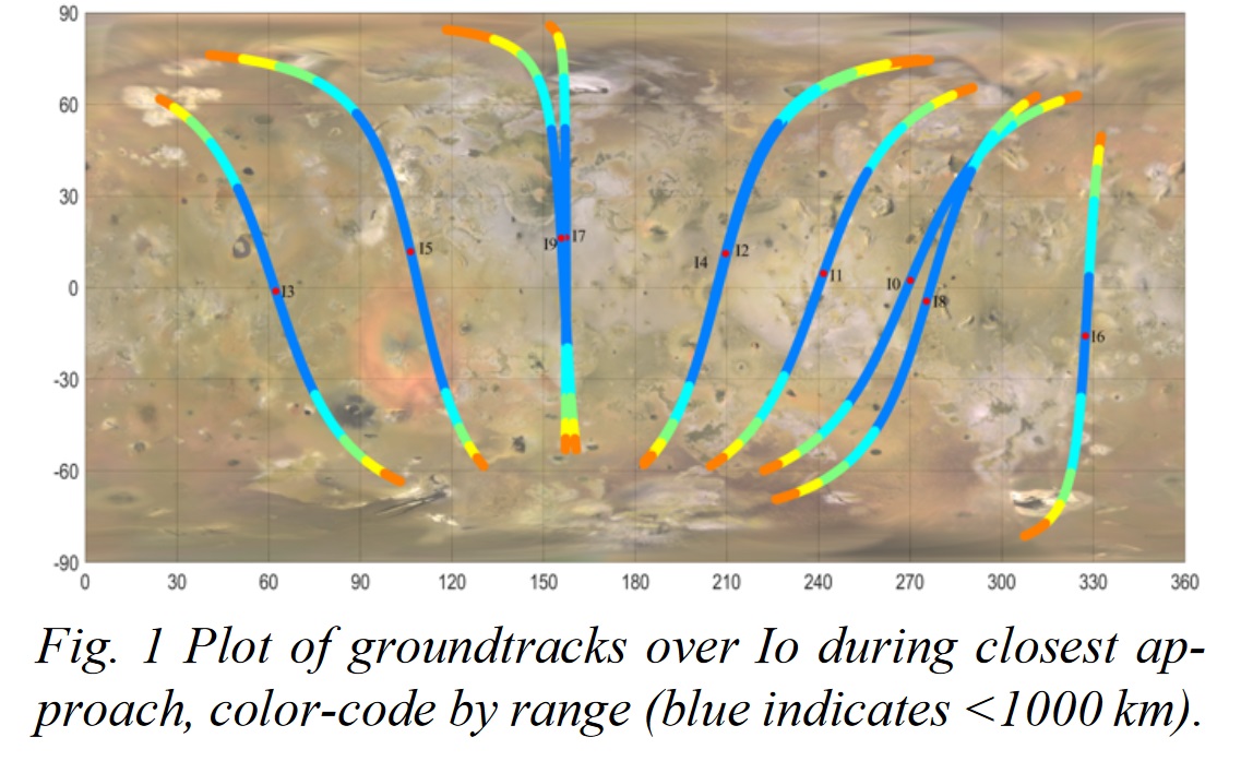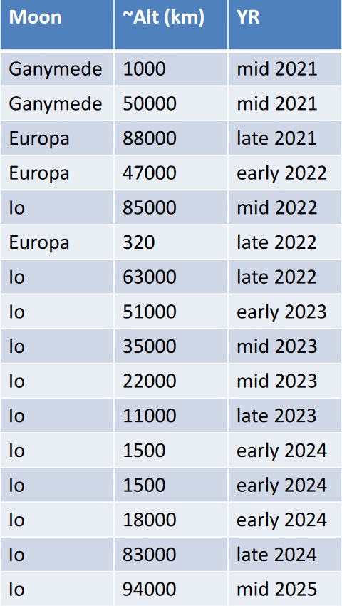 Расписание пролётов Джуно мимо спутников Юпитера в случае утверждения расширенной миссии. 11 пролётов будут сфокусированы на Ио, начнутся с 2022 года. На аппарате есть инфракрасные камеры, которые смогут увидеть все извержения в их блеске, пролёты будут над полярными регионами, которые слабо изучены. Ультрафиолетовые камеры могут изучать атмосферу на ночной стороне Ио, дымку и плюмы извержений на лимбе. Различные магнетометры и детекторы плазмы-частиц охуеют конечно при пролёте через тор.