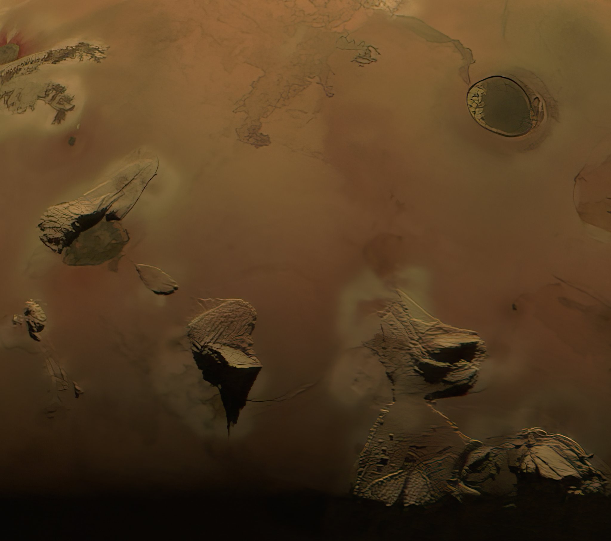 Поверхность Ио вдали от вулканов может показаться ровной, но это может быть далеко от правды. Возможно сублимация серы порождает бугорковые ячеистые структуры, подобные холмам