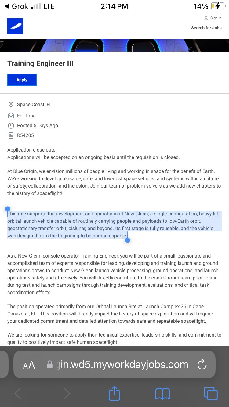 В объявлениях о вакансиях Blue Origin для New Glenn подчеркивается, что он разработан так, чтобы «быть способным регулярно доставлять людей и грузы на низкую околоземную орбиту, геостационарную переходную орбиту, окололунную орбиту и за ее пределы. ... с самого начала был разработан для перевозки людей». Blue Origin явно что-то планирует.