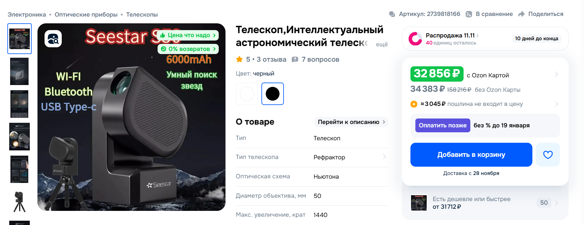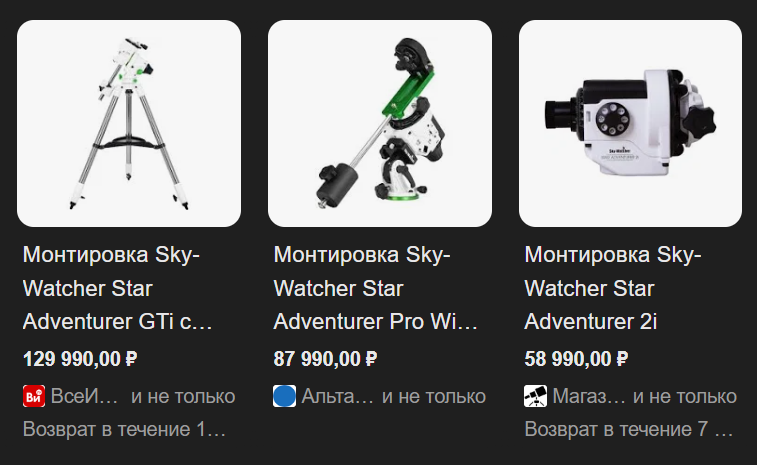 продаст ли кто доставкой телескоп skywatcher 909 на az3 за 20к? Вообще лучше переплатить и купить на eq2 или на az3, которая подешевле и по идее поустойчивее?Почему кстати много кто его продает, смотрю популярен, не говно ли он на самом деле и не завышены ли эти цены? На руках сейчас ровно 20к свободных, поэтому склоняюсь купить 909 на az3 сразу, если он не говно, т.к. eq2 с такой трубой не вызывает особого доверия если честно, ещё и нормисы втюхивают за 35к и не хотят торговаться.