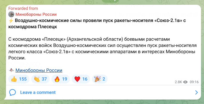 В 13 часов 50 минут (мск) с Государственного испытательного космодрома Министерства обороны Российской Федерации (космодром «Плесецк») в Архангельской области боевым расчетом космических войск Воздушно-космических сил успешно осуществлен пуск ракеты-носителя легкого класса «Ангара-1.2» с космическими аппаратами в интересах Минобороны России.