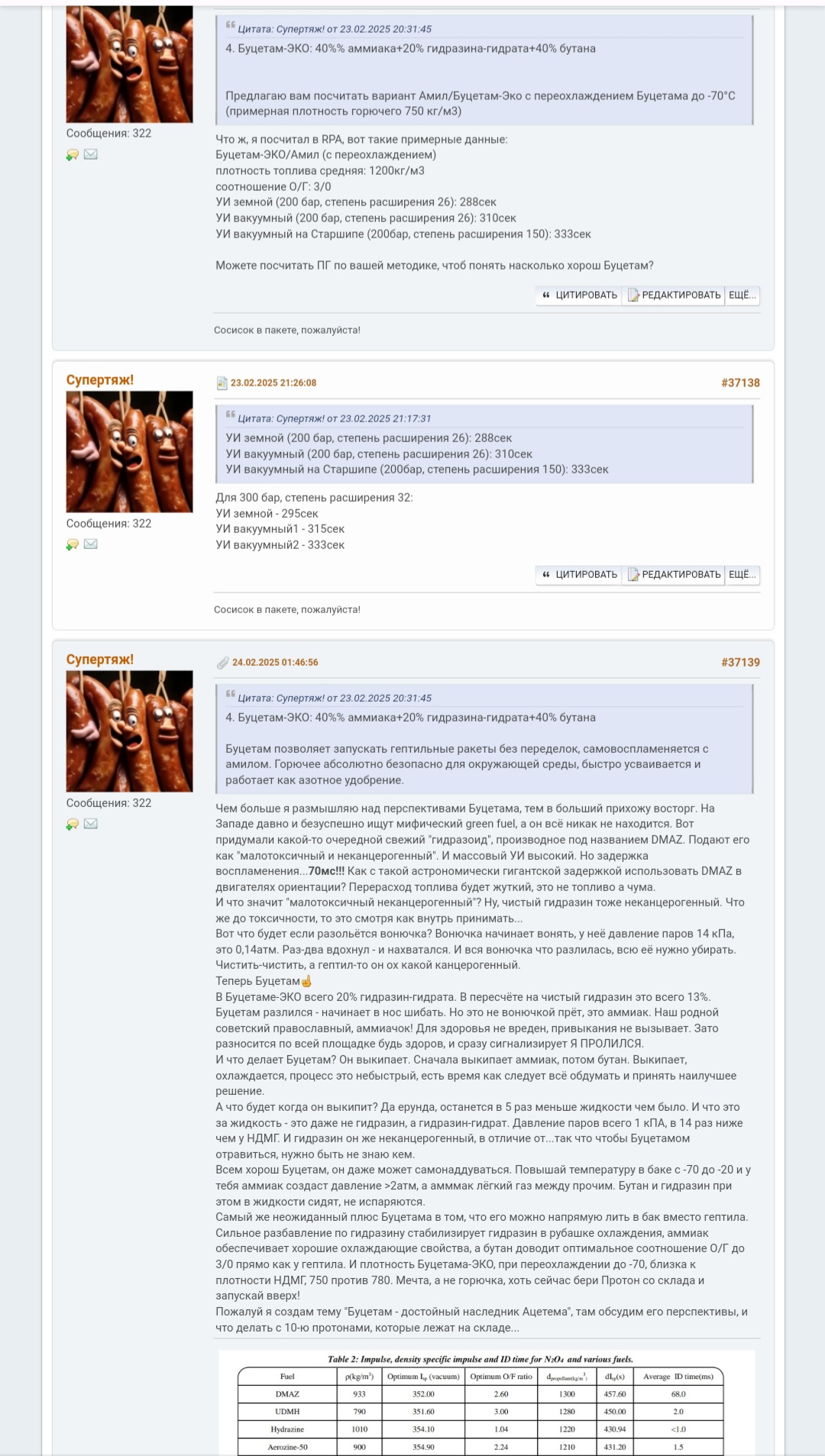 >>804692 Воот! Горд высоким уровнем родного Спейсача, что даже передовые топливные разработки знают. Единственная поправка, не 20% гидразина а 20% гидразин-гидрата. Это, во-первых, ради большей безопасности при проливах, у гидразин-гидрата ниже давление гидразиновых паров (больше вдохов потребуется для отравления). Во-вторых у гидрата температура замерзания -50 градусов, а у гидразина +2 градуса. В итоге Буцетам на гидрате можно переохлаждать, растёт плотность.