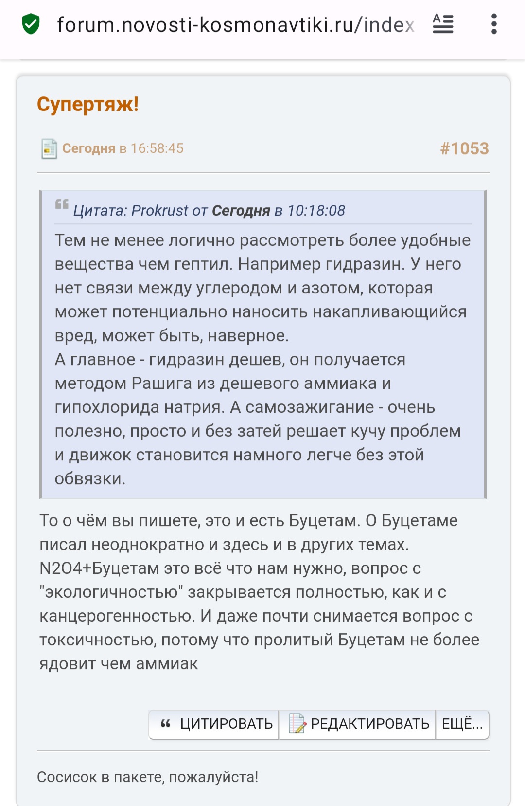 Задал вопрос Павлу Пушкину, проектировщику Ангары, директору Космокурса. В отрасли он вроде как не работает уже, но связи-то остались. Рокет пиплз должны знать о Буцетаме, всеми способами буду его продвигать, ибо 10 Протонов в тюрьме (на складе) смотрят на меня как на последнюю надежду!