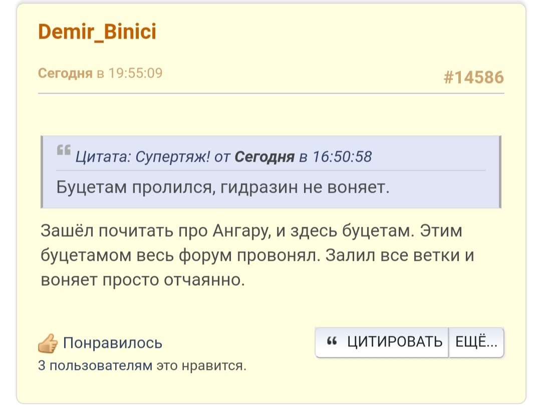 Странно...Буцетам начинался как мем, но пока я его форсил, даже сам осознал насколько же Буцетам охуенен. У него есть все преимущества гептила, есть даже те которых у Гептила нет (самонаддув и дешевизна). Но при этом пролитая лужа гептила это катастрофа для незащищённого персонала. А лужа Буцетама не токсичней лужи аммиака. Любой беспечный чувак в шортах просто сбегает за химкостюмом, не понеся никакого дамага. И через 15 минут вернётся во всеоружии и ликвидирует чёртову лужу. А Буцетам терпеливо подождёт, он долго-долго выкипает. Я уже буквально хочу поскорее залить такой хороший экоБуцетам в баки своего Дракона и полететь в космос, попыхивая импульсами из системы ориентации во все стоороны. Илон Маск, почему он так ещё не сделал? Да потому что не додумался до Буцетама. А я додумался, я продвинул Русский Космос, и Протоны полетят вперёд. Ура Русскому Космосу! Ура мне!