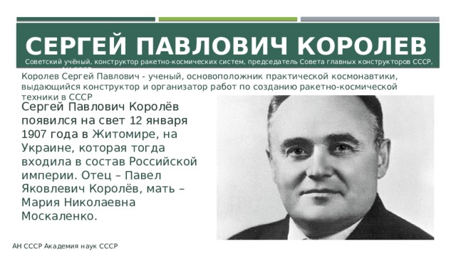 Сергей Павлович Королёв, главный конструктор советской ракетно-космической программы, был русским по национальности.