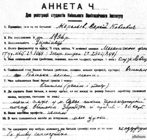 >>819724 >Королев по происхождению считал себя украинцем Он считал себя и был русским, с русской фамилией. А этот бланк на мойве не факт что он сам лично заполнял