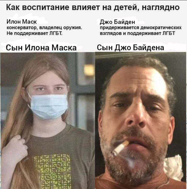 маск никогда не владел оружием как минимум до всего этого оправения в 2020ых годах. алсо маск всегда искренне поддерживал лгбт пока не начали делать операции и кормить таблетками детей. и консерватором маск никогда не был, максимум центристом. а вот какие там взгляды у байдена на самом деле - одному богу известно, тем более они вполне могли меняться на протяжении его жизни, в молодости он там говорил что если белые и чёрные дети будут учиться вместе то это будет какие-то городские джунгли, а ещё говорил что бедные дети могут учиться так же хорошо как и белые дети или что-то такое. короче байден это максимальный слизень пиздобол приспособленец, политический флюгер. напоминает одного низкорослого политика с бурятским ебалом когда он лыбу давит который уже сколько там, 25 лет у власти, в одной стране, и тоже многого противоречащего друг другу наговорил за эти 25 лет