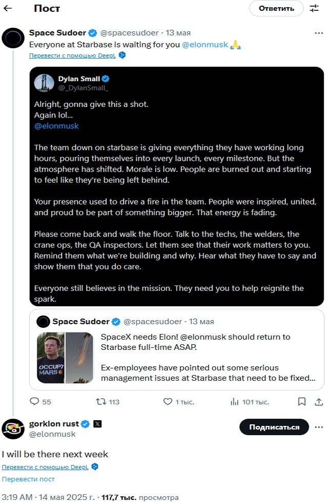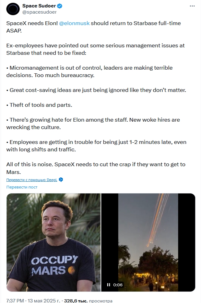 Ребята, не кипишуйте! Сидите тихо, сейчас такой момент, нужно переждать! Просто завяжите узелком свои хотелки, не время предъявлять претензии Маску. Поверьте, там все знают лучше вас, там люди, управляющие компанией уже давно, а не вчерашние школьники. Они понимают, что делают. Горит Starship - значит должен гореть, внезапно взорвался - значит так нужно. Сейчас очень напряженный момент, некоторые много ходовые операции в критически важной стадии! Враги и конкуренты все это уже поняли, и сейчас может рвануть в любом месте, в любой момент. Необходимо сплотиться и не реагировать на провокации! За вас все сделают те, кто сверху, не беспокойтесь! И вы не узнаете Starbase, все зацветет! Главное - потерпеть!