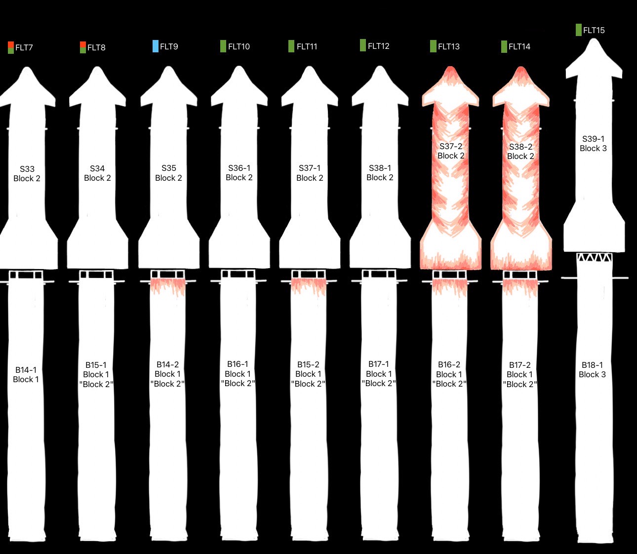 >>807830 >что значат цвета полос сверху и красные разводы? Уже летавшие - на Суперхэви подкоптили верхушку типо при горячем разделении, а со Старшипами и так понятно.