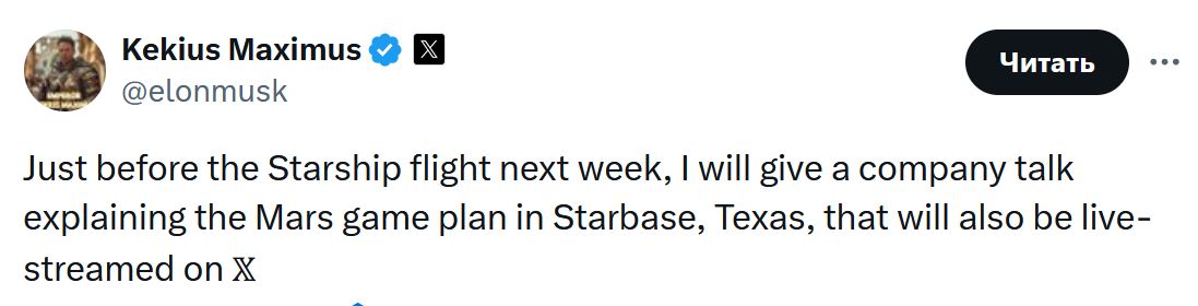 >Just before the Starship flight next week, I will give a company talk explaining the Mars game plan in Starbase, Texas, that will also be live-streamed on 𝕏