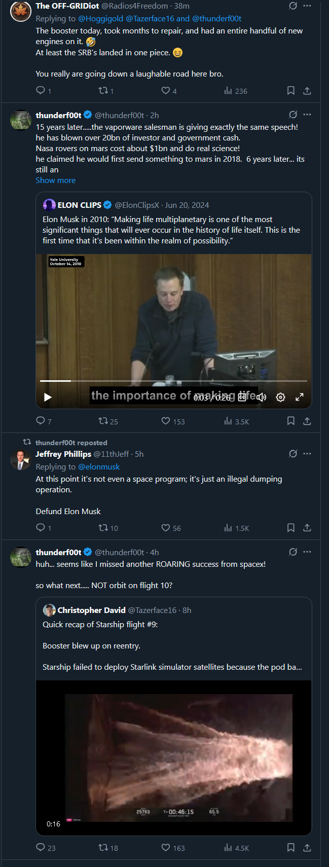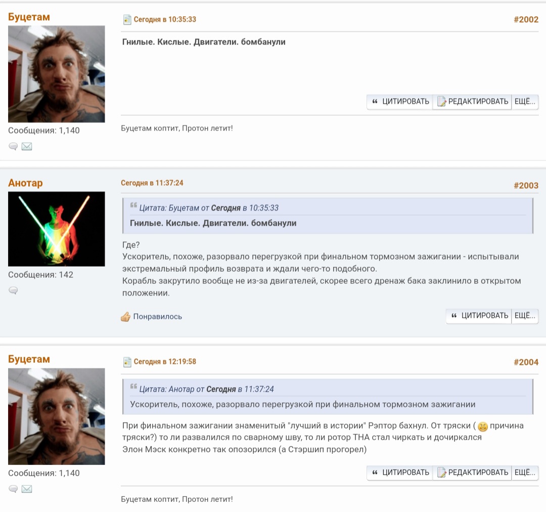 Короче уносите - это нихуя не будет работать - вообще и никогда. Или на доработку потребуется 5 лет. Теперь я понимаю тех, кто ставит против Старшипа - тот же Карлсон со своим Бегемотом. Раньше я думал -нахуя, а теперь понимаю нахуя. Молодцы - они лучше Флакона, а про Старшип можно пока что забыть - значит и монополия Spx будет подорвана, заказы начнут уходить к другим