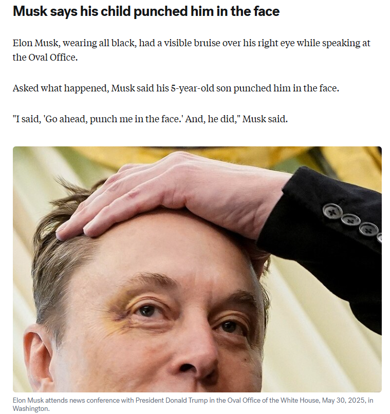>На вопрос о том, что произошло, Маск ответил, что его пятилетний сын ударил его по лицу. >«Я сказал: «Давай, ударь меня по лицу». И он это сделал», — сказал Маск.