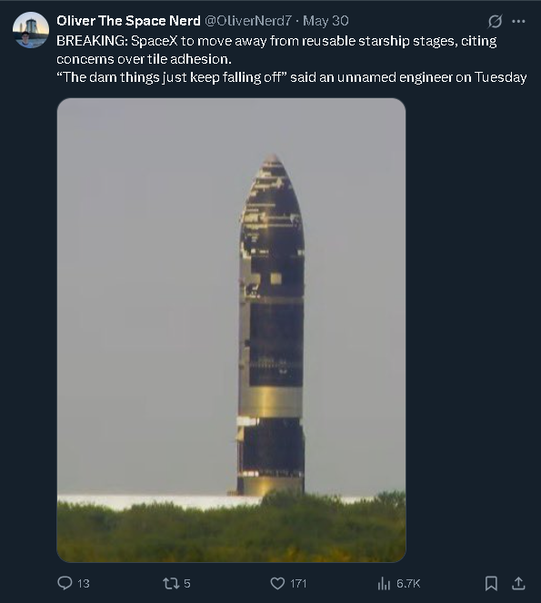 Алсо занимательный видос https://youtu.be/7Zf1wThjv7g?si=D_a1OfKR7mCQarO4 - Зубрин считает, что кое-что Олень не так планирует с Марсом (и Луной) - лэндер нужен маленький, а не здоровый старшип HLS. И говорит, что миллион вещей не разработаны еще, которые необходимы для чоловiков на Марсе, поэтому какой нахуй Марс в 2028, что мол за бред Олень несет? И нужна кооперация с государством, Олень в одиночку не потянет, и к тому же нужны ядерные реакторы на Марсе, а соответствующим топливом владеет только государство.