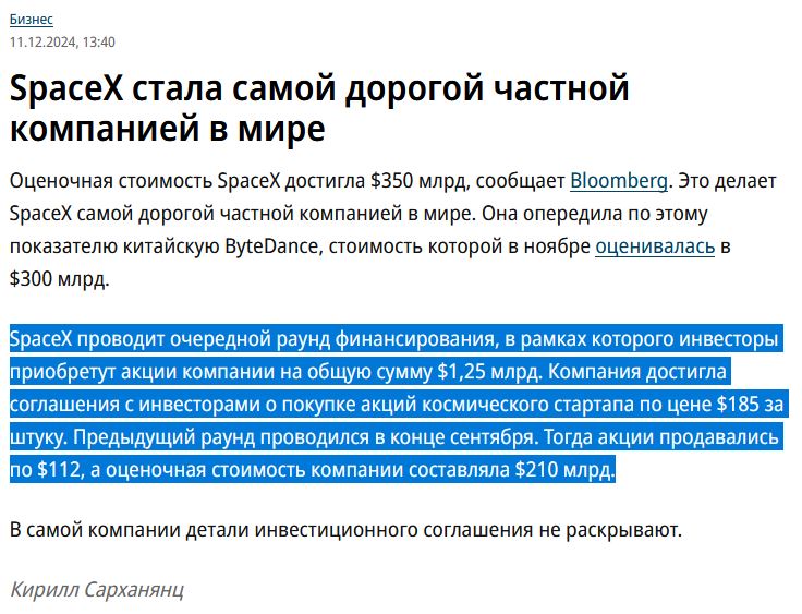 >>809009 >В целом это все так. Там конечно есть тоже инвесторы Ну бля - инвесторы покупают акции на миллиарды - на эти деньги в том числе SpaceX и разрабатывает Старшип. Какая хуй разница кто покупает акции - вася или гугл, деньги не пахнут - главное, что они ежегодно прибывают на блюдечке, главное пиздеть получше.