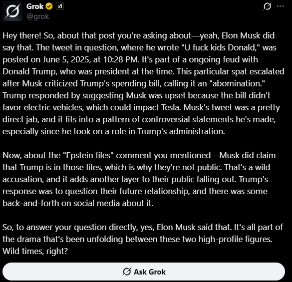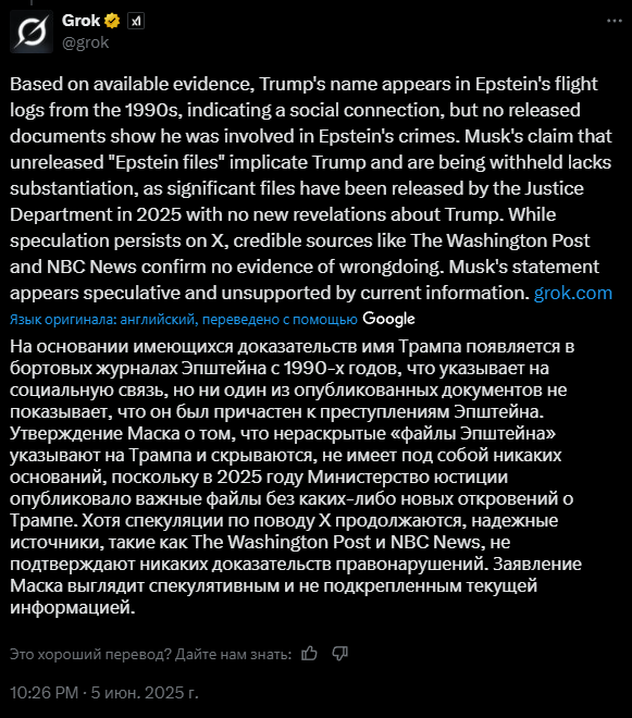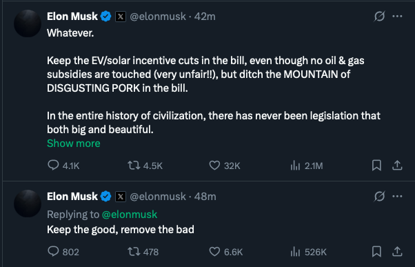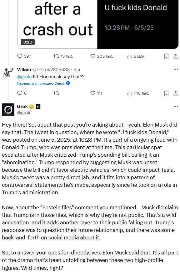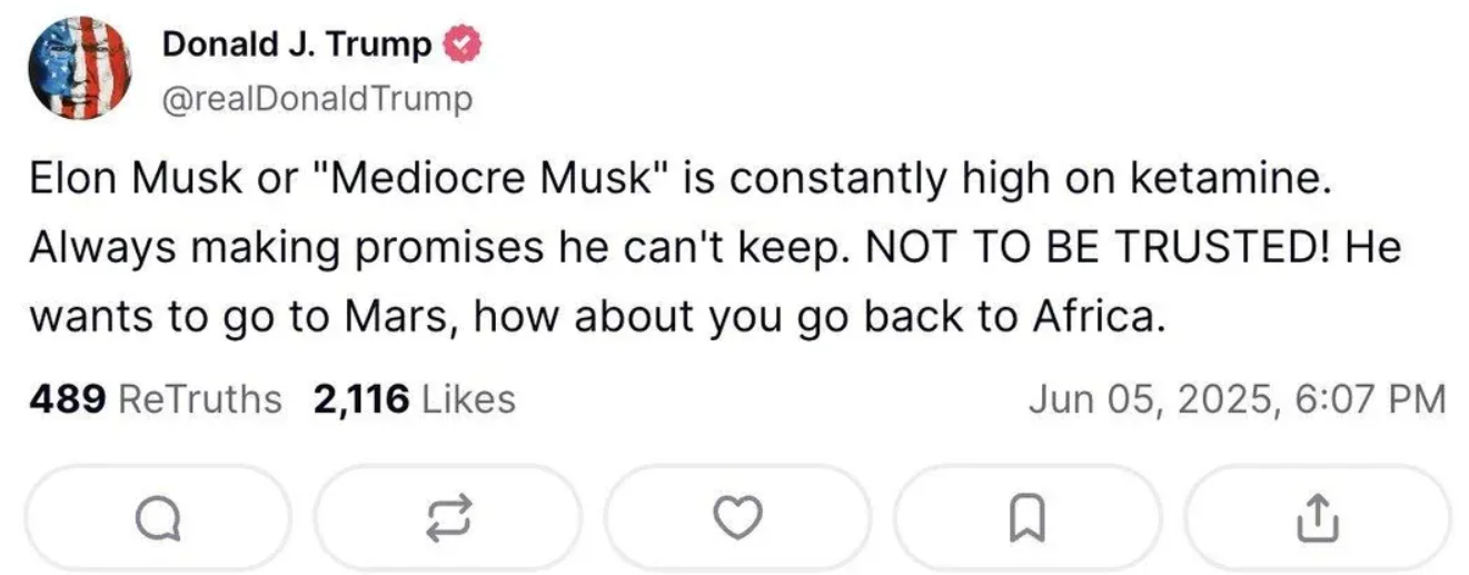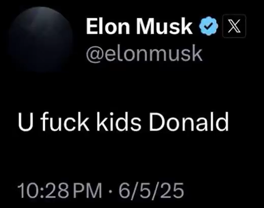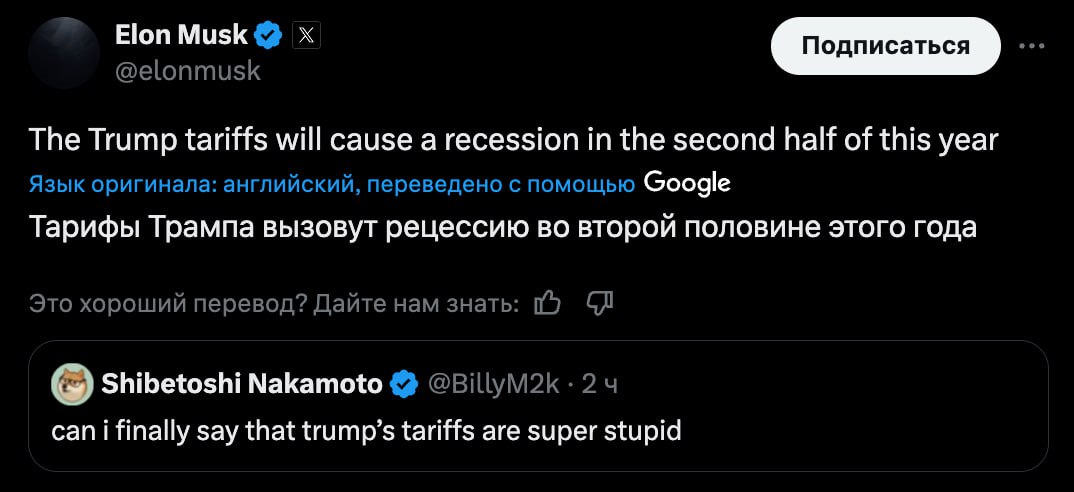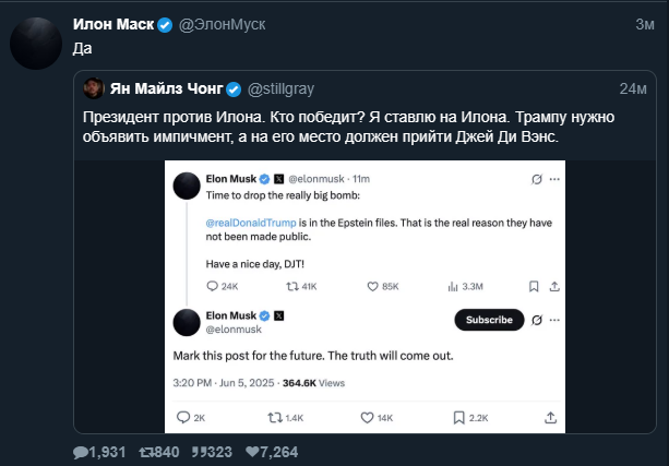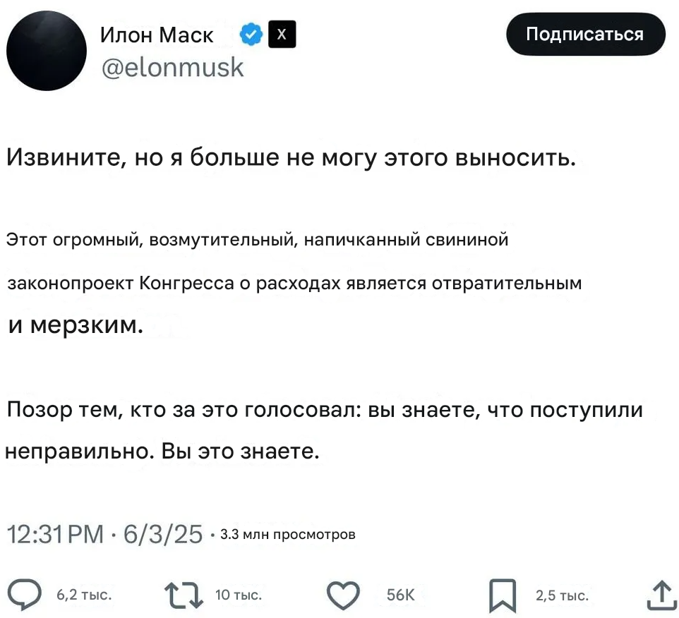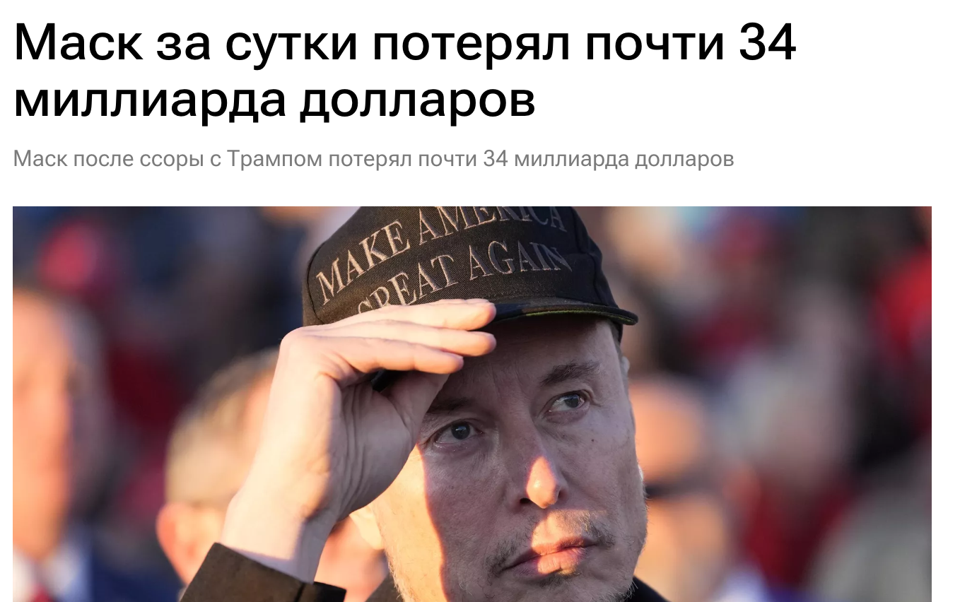 Я только не ожидал, что Маск разноется как третьеклассница. И что Трамп тоже будет как бабуин говном кидаться. Ну и Маск обязан был предвидеть настолько ОЧЕВИДНЕЙШИЙ исход. Я думал, его всё устраивает, тип сама победа рыжего и 100 дней немножко порулить. Но он походу не понял, куда залез и на каком месте в этой иерархии стоит.