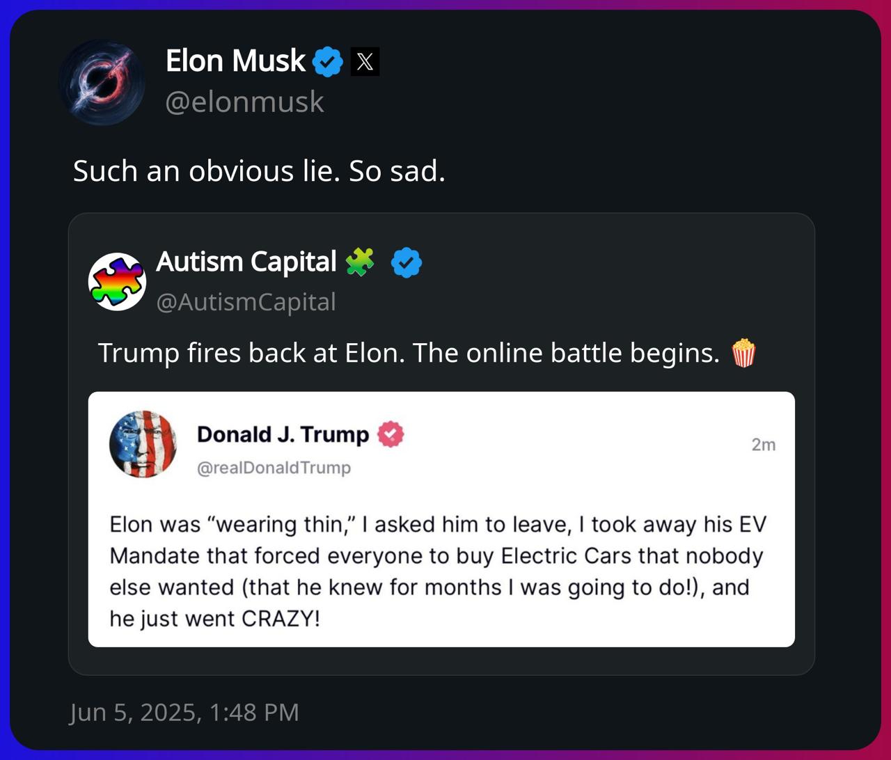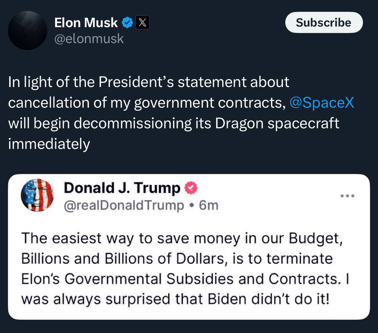 Короч, всё наверн было так (ну или хз, как): Пропихнув своего Трампа в президеты, Маск сделал DOGE и даже зигу от радости кинул - ну теперь держитесь. Ну и на следующий день сразу же побежал руководить, как у себя на Старшипах. Но государство - это не Старшип и там не получится взять всё и переделать. Кроме Маска там есть и другие начальники и эти начальники, вместо того, чтобы писать отчеты о своей эффективности, побежали к Трампу жаловаться, мол что это за хуита. Трамп попросил Маска немношк сбавить обороты. Маск не сбавил. В итоге Маска выгнали из его же DOGE и он надулся. Ничего не упустил?