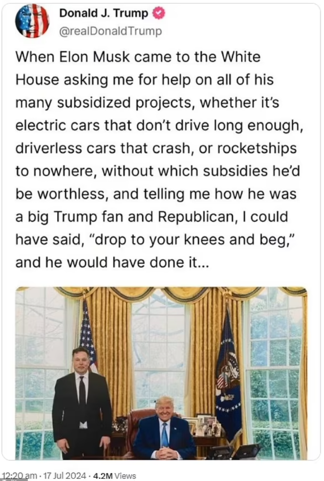 >>809236 А ведь Трамп не отменял контракты. Трамп просто привёл пример гипотетической ситуации, отвечая на визг Маска про бюджет, но омеган бомбанул, прочитал жопой и реально пошёл сам первый рвать госконтракт.