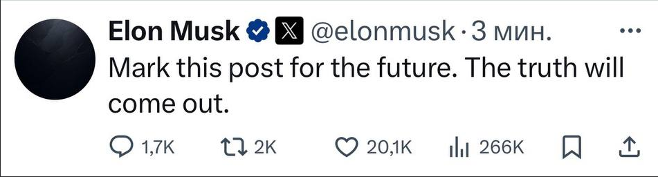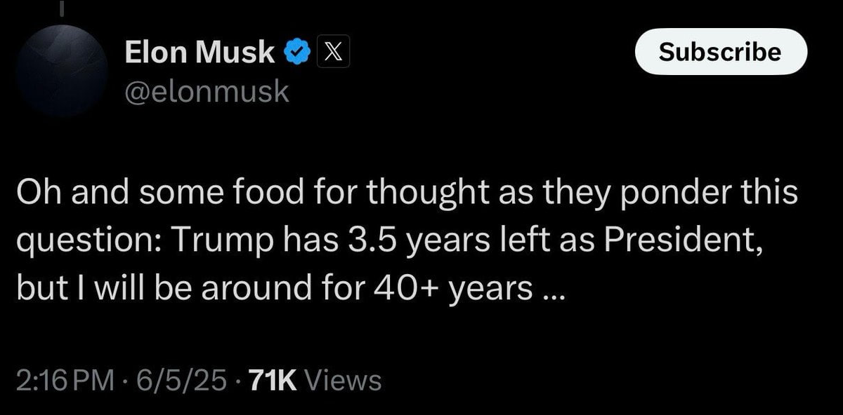 Нет, ну всё ещё есть шанс, что этот спектакль был ради перевода США на однопартийную систему. То есть Маск создает свою социальную партию "Справедливая Америка", которая не претендует на голоса свыше 5...10% , но отбирает голоса у Демократов. То есть теперь те, кто против Трампа будут голосовать не только за демократов, но и за Справедливую Америку. А Маск будет лишь на словах противником Трампа - на деле же никак не мешая его курсу.