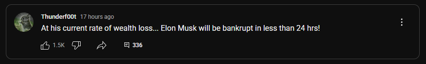 >>809382 "current wealth loss" Маска, если брать тесла, равен +5% за день (любое биржевое падение обычно потом имеет коррекцию). Т.е. через сутки он станет богаче на 20 миллиардов. Какие же маскохейтеры дегенераты, боже