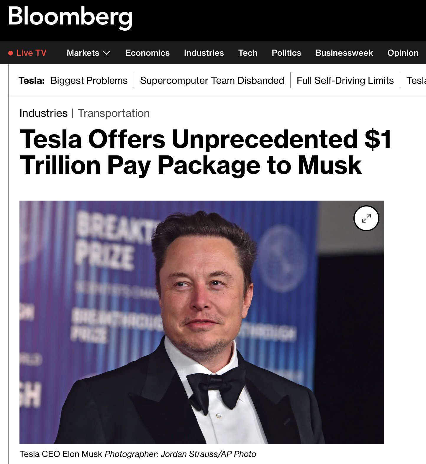 >5 сентября (Рейтер) — Tesla (TSLA.O), совет директоров предложил план компенсации в размере 1 триллиона долларов для генерального директора Илона Маска, который станет крупнейшим корпоративным пакетом выплат в истории, что подчеркивает влияние Маска на автопроизводителя, пытающегося превратить его в центр искусственного интеллекта и робототехники.