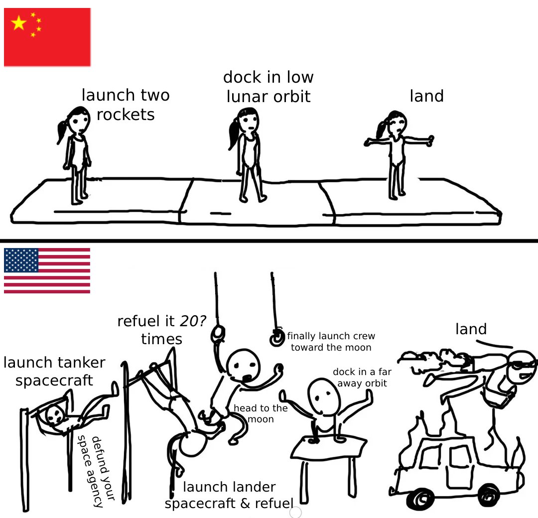 >Bridenstine cautioned that the fragile and SpaceX-reliant infrastructure for mission success makes the current U.S. design vulnerable, citing the work remaining to get Starship operational and the need for "up to dozens" of refueling launches in order to complete each of its missions to the lunar surface. "Unless something changes, it is highly unlikely the United States will beat China’s projected timeline," he said.