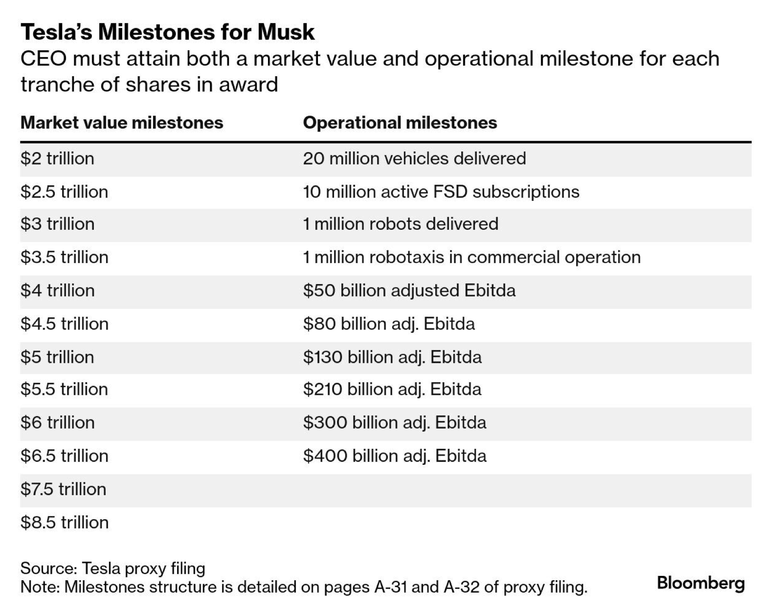 >>816862 Чтобы заставить его работать, если цели не будут достигнуты (рост рыночной капитализации Tesla с текущих 1 триллиона до 8,5 триллиона долларов, производство и поставка 20 миллионов автомобилей, запуск в эксплуатацию миллиона роботакси и миллиона гуманоидных роботов Optimus, а также достижение 400 миллиардов долларов скорректированной EBITDA за четыре последовательных квартала) - то он не получит нихуя. Может просто заебал своим поведением, политикой - такой способ приземлить и закабалить чувачка