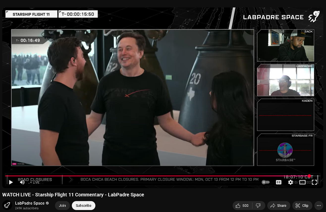 >Today we celebrated the Flight 5 first ever Super Heavy booster catch anniversary - with a successful Flight 11 flight test with a re-flown Super Heavy booster!! 🙌🏽 Congrats to the whole SpaceX team on the incredible and fast paced progress over the course of a single year! Deploying Starlink simulators, relighting Raptor engines in space, ship splashdowns and more! Heres a Flight 5 memory to commemorate lol @kate_tice @danhuot