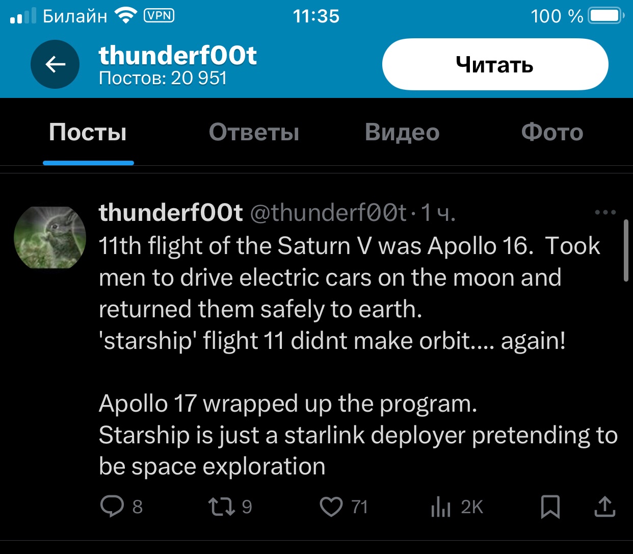 Я просто напомню, что делал Сатурн на своем 11ом полете >Ряяя было бы у свитого Илония такой бюджет, как у Аппалона он бы уже всех людей на планете на Марс и обратно бесплатно покатал Во-первых, бюджет Аполлона это не только ракета, а еще куча всего типа роверов, обучения астронавтов. Во-вторых, Илошиных пол триллиона хватило бы на весь Аполлон.