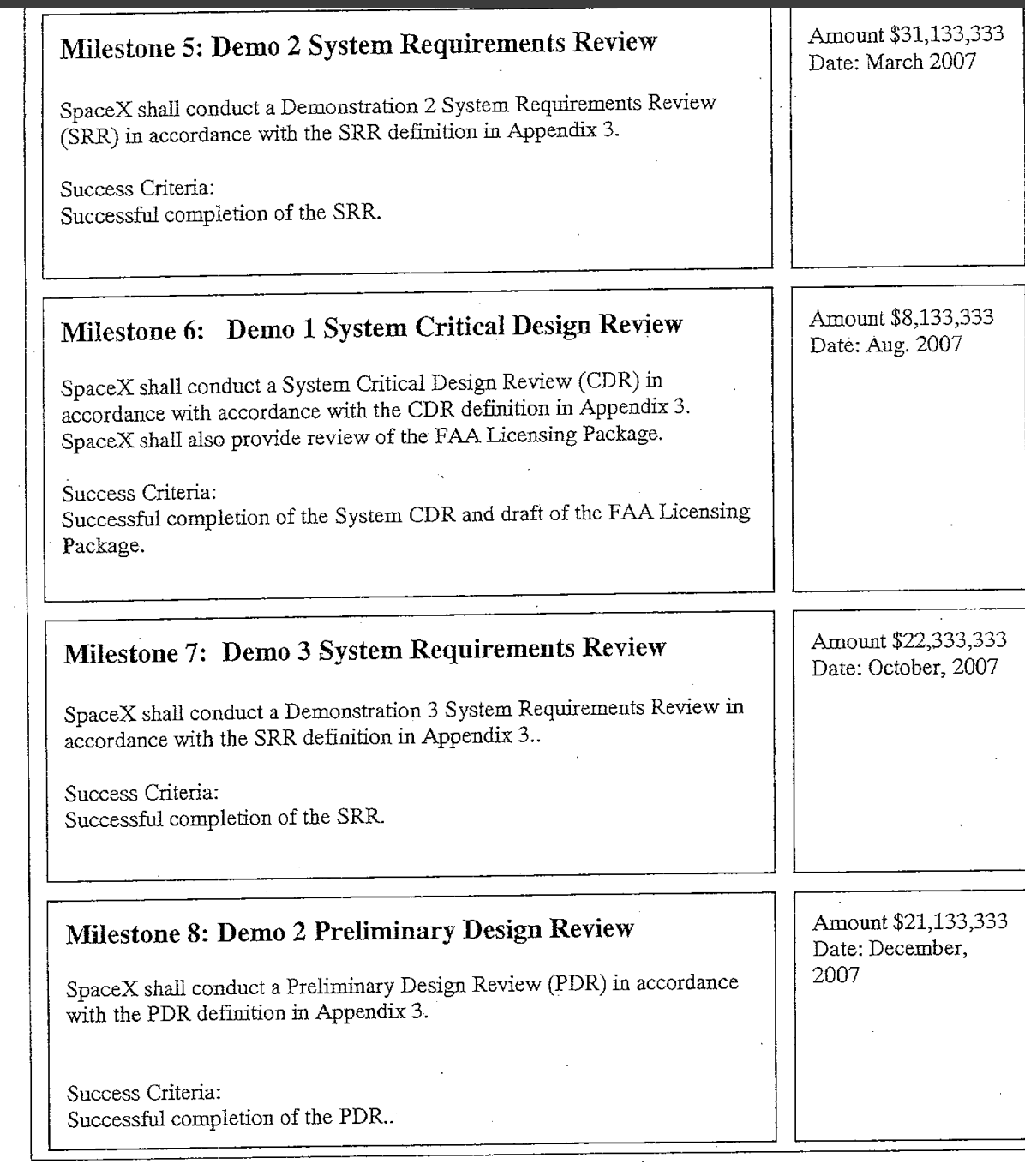 После успешного 4-го запуск, доказав работоспособность ракеты, SpaceX получили новый контракт, но, опять же, не в качестве единовременной выплаты, а с этапами.