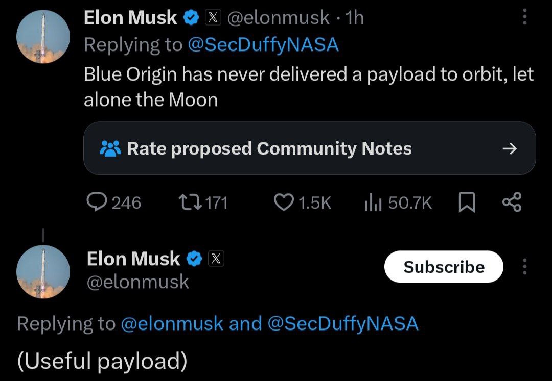 Есть еще такое соображение от ютубера Angry Astronaut: Олень ведь обозвал и вообще зачморил главу НАСА в твиторе. Он не стал бы это делать, если бы не понимал, что УЖЕ ВСЁ ПРОЕБАЛ. Больше денег ему НАСА не даст и он это знает. Значит всё, только вариант Blue Moon остается в гонке.