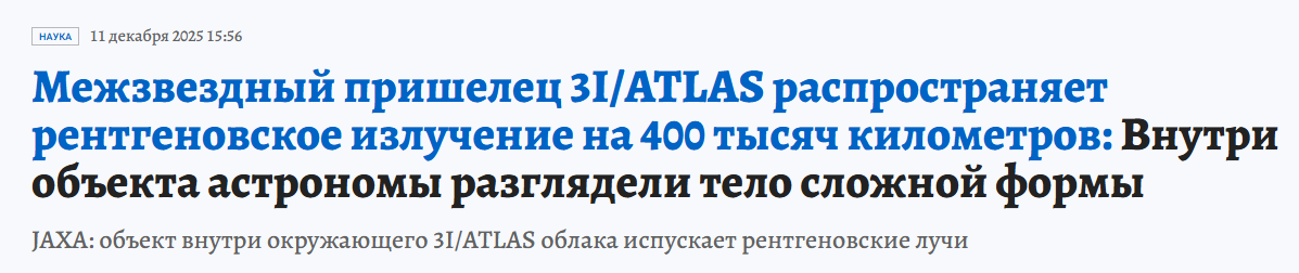 Ещё одна недавно выявленная странность, на которую обращает внимание пензенский эксперт, это рентгеновское излучение от 3I/ATLAS. Это самое первое и до сих пор единственное в истории изучения звёздного неба рентгеновское излучение от известных науке космических объектов.