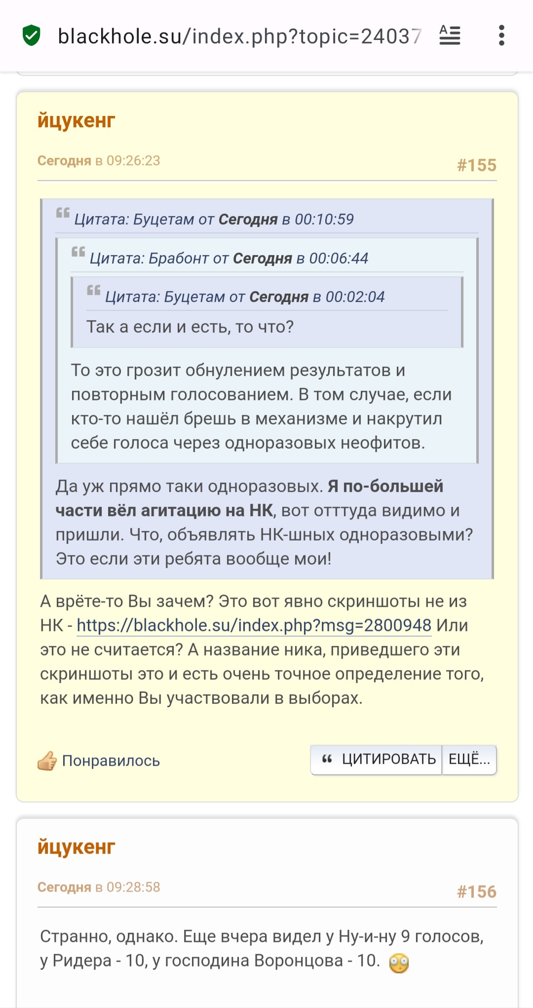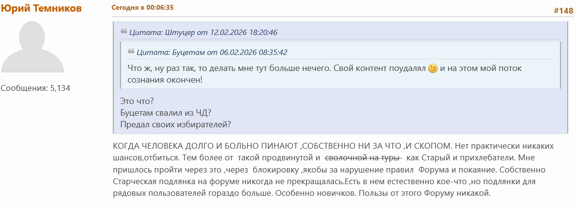 Так, мне выписали бан 10% на ЧД, запрет на постинг. Кто-то удалил мой полностью рилейтед-пост из предвыборного треда и перенёс в Корзину. Подозреваю что забанил Дмитрий Винницкий, возможно Старый. Считаю, вахтёры-пидорасы должны за это заплатить. Лучшей ответочкой будет показное макание в говёх на выборах!