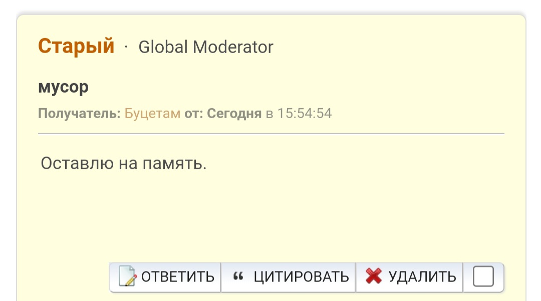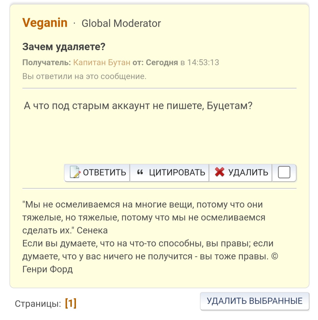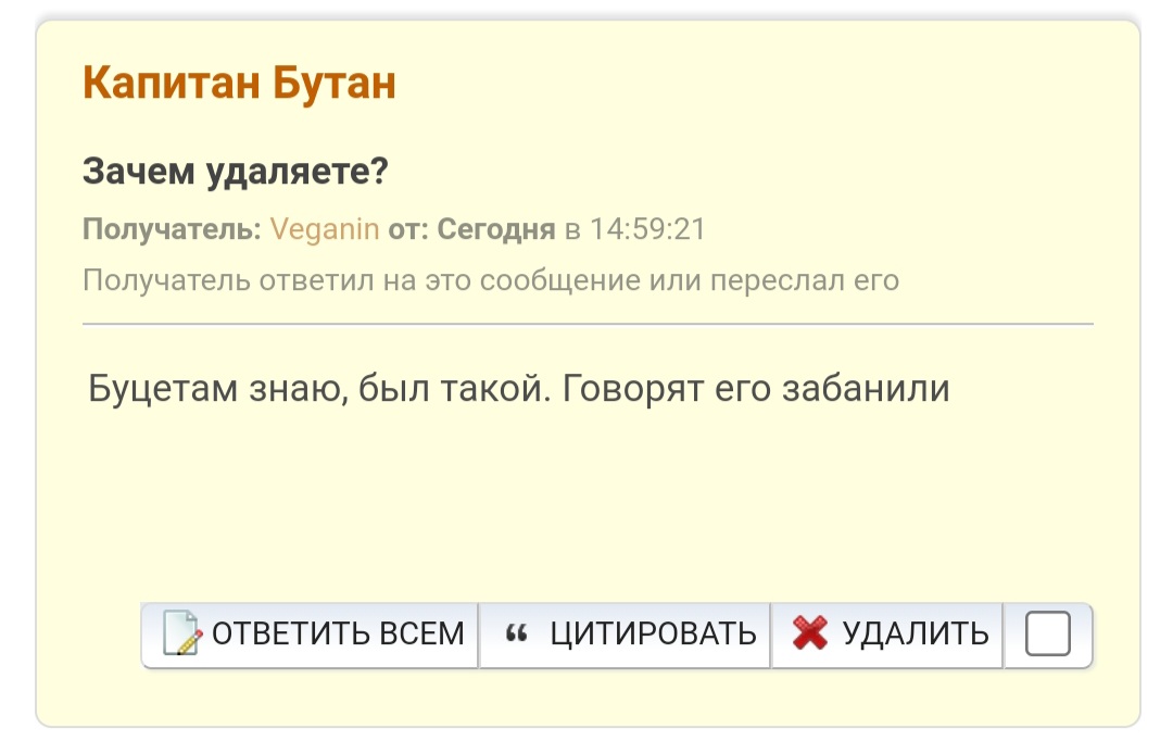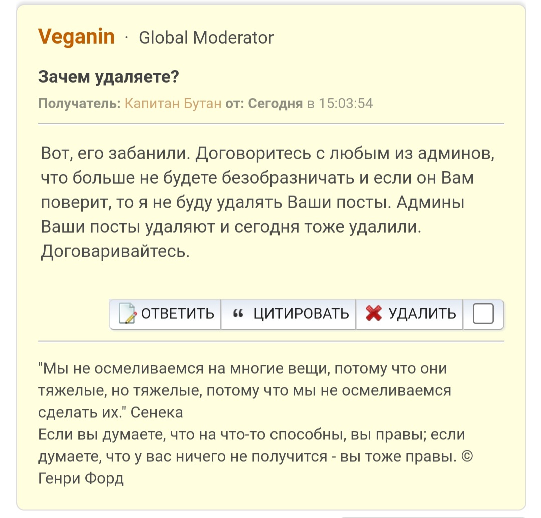 Капец че происходит!! Глобал модер Веганин только что признался, что мелкомодам отдан приказ давить Буцетама и всех похожих чуваков. Это на НК такая сознательная крысиная политика что невиновного Капитана Бутана банят по-беспределу! "Договаривайся с администрацией", да ХУЙ ВАМ волчары вахтерские. Чтоб я с такой гнилой администрацией на договорняк пошёл? Не будет!!! Принял решение, отсижу весь бан осталось 10 дней , выйду и потру вообще все основные сообщения па НК, весь оригинальный контент с разработками. Уйду с НК, врлчары пыль проглотят