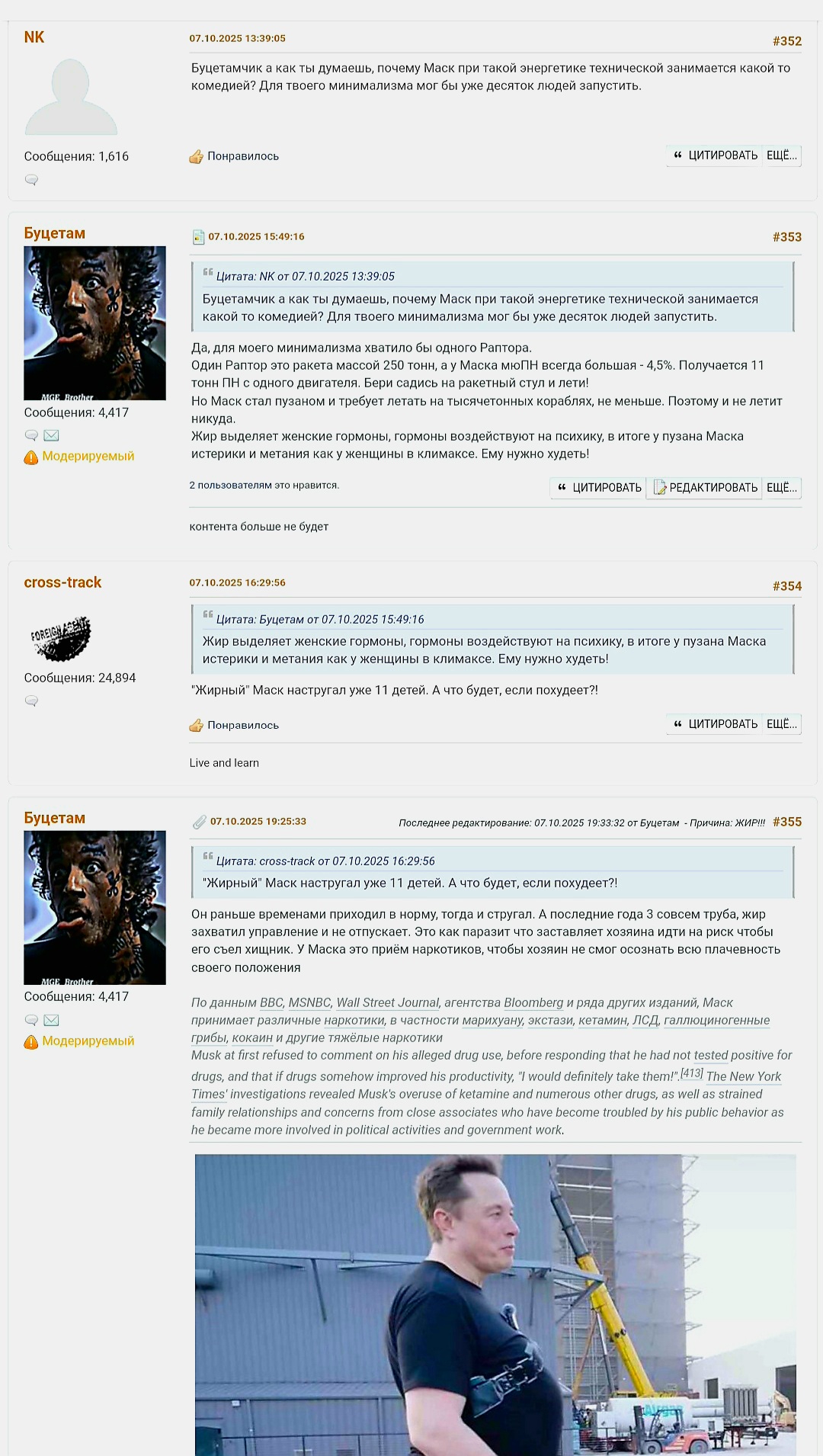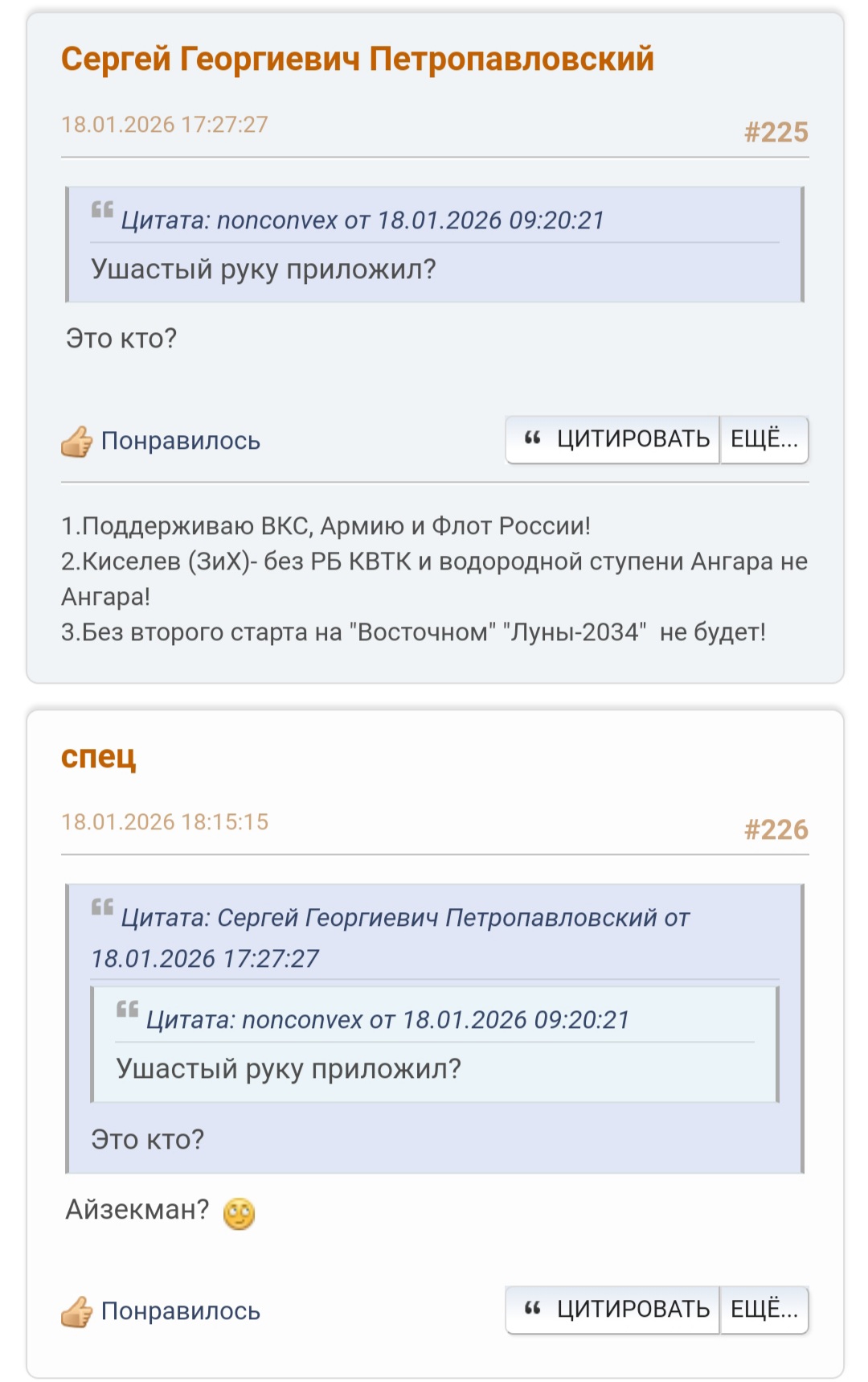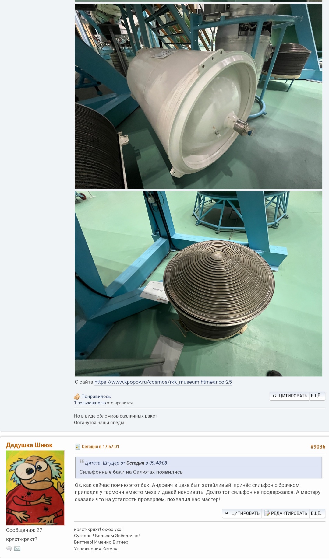 >>832289 >Ананасы, кто? Не, не я. Прост знакомые логины вспоминал - прикольный чувак был на Астрофоруме, мы с ним много спорили по поводу Старшипов. Потом вроде немного крышняком поехал и пропал оттуда, может ща вернулся - короче начал задвигать "у SpaceX есть настоящие Старшипы спрятанные, а то что мы видим - для отвлечения конкурентов". С 95% вероятности он же на НК под ником Шлангенциркуль - но до конца не уверен. Короче глаза - мне нужны его глаза, чтобы спросить с него за его бред - дайте мне Кремальеру) А вообще прикольный чувак - у них там была "секта" по колонизации Марса где они прям на приличном уровне все темы прошарили. Очень грамотный, скажем так.