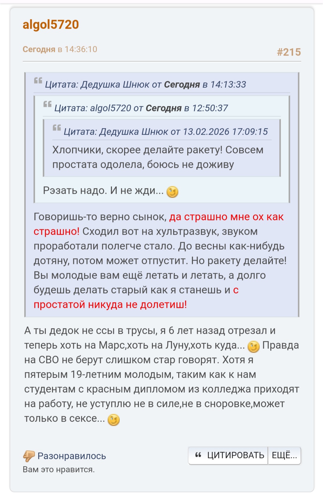 >>832290 >Шлангенциркуль Видел такого, не знал что он поех >у SpaceX есть настоящие Старшипы спрятанные, а то что мы видим - для отвлечения конкурентов Воу мощно, настоящие старшипы с блэкфейсом и прянями? Возможно они существуют, но стоят в ангарах и на них устраиваются "дикие вечеринки"(с) Ты ж в курсе что Эпстин выжил, у трупа другой нос (с горбинкой) и другие ушные хрящи? Его эвакуировали из тюрячки, возможно план такой что Эпштейн полетит на Марс/Луну за пределы земной юрисдикции, а пока что тусит на настоящих старшипах на Старбазе >А вообще прикольный чувак - у них там была "секта" по колонизации Марса где они прям на приличном уровне все темы прошарили. Очень грамотный, скажем так. Вот честно, почитал бы. Я ж тоже немного из этих, из колонизаторов. Начинал я с нюханья аммиака и создания тредов-гигантошизиков Колонизации газовых гигантов тред Скажу тебе, через вдыхание атмосферы Сатурна я многое познал, моя шиза полностью оформилась. Хотя я понимаю что ошизел, но не до конца уверен в этом. Всегда остаётся вероятность что я действительно преисполнился, а готовность признать за собой "шизу" это лишь остаточная слабость человека, не осмеливающегося шагнуть навстречу бытию сверхчеловеком. Двойственное состояние, но я всё ближе к тому чтобы сделать этот шаг. Каждый год приносит новые детали >>832291 >Подожди - а там что все свежие ники видно? Видно кто сидит в треде. Чтобы скрыть, нужно в настройках акка убрать "отображать онлайн-статус"