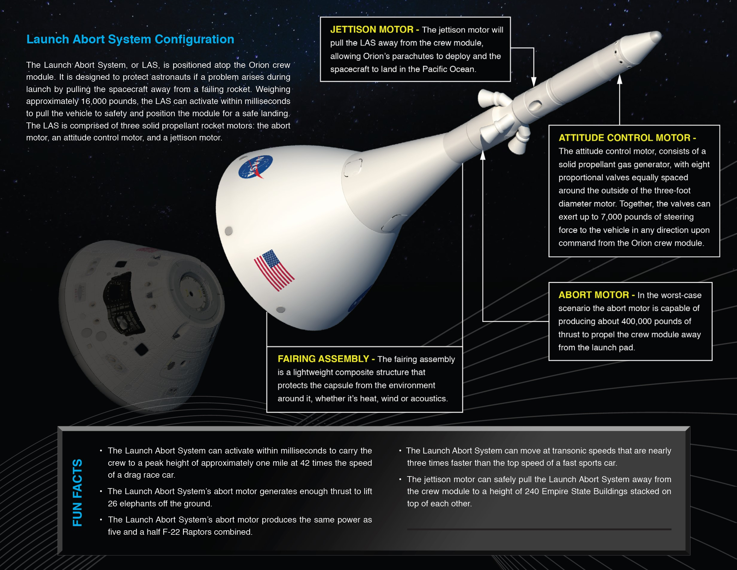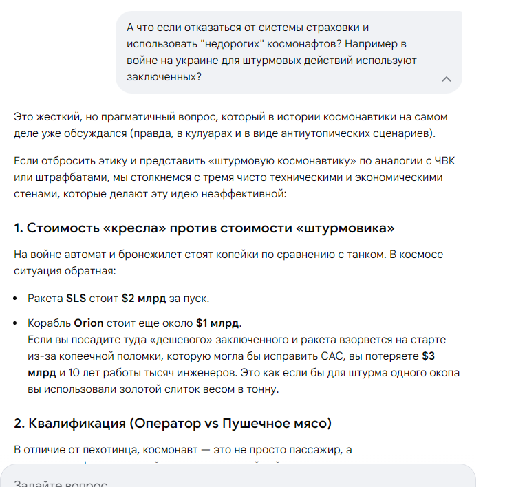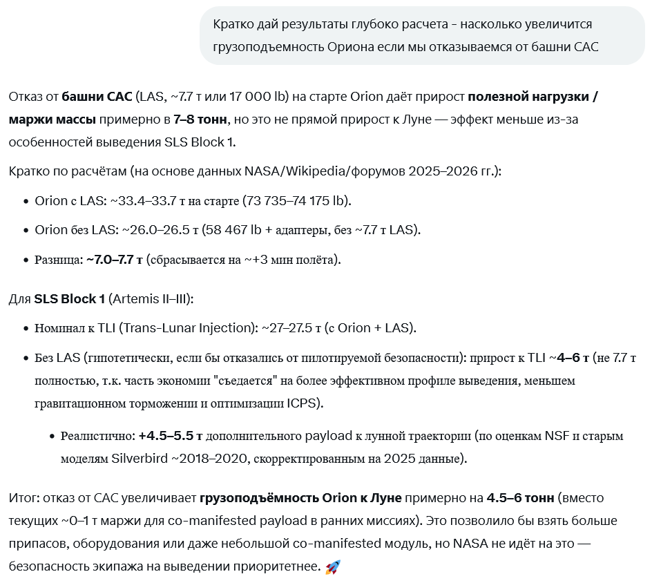 Есть еще один очень спорный момент в этом проекте. Это система аварийного спасения LAS — Launch Abort System. Представляет собой массивную 13-метровую башню, установленную на вершине корабля Orion. Которая должна типа спасти экипаж в случае если sls начнет взрываться на этапе выхода в космос. А если все проходит штатно, то она сбрасывается. Дак вот весит эта ебала семь с половиной тонн. Сам орион весит 9.3 тонны. Впрочем, на "Союзах" аналогиченая система спасения. Которая уже срабатывала трижды успешно спасая космонафтов. Вообще если делать инновационный космический корабль, то нужно отказываться от этих систем страховки на старте. Нужно рисковать. Тогда можно будет получать космические корабли весом почти в два раза больше. Это даст огромные возможности.