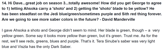 >>116592 > белый цвет меча означает что-то типа серого джедая Десять раз уже разжевали. Ничего он не означает. Кристалл стает белым, когда теряет свой основной цвет. Асока "исцелила" скоррапченый красный кристалл, но он не смог вернуться к своему оригинальному цвету и стал белым. Вообще даже в новоканоне цвета у кристаллов могуть быть любые, есть же черный и его никак не объясняют и не акцентируют на этом внимания. Джедаи берут крисы на Илуме, а там только оттенки синего, зеленого и желтого, в других местах могут быть другие цвета.